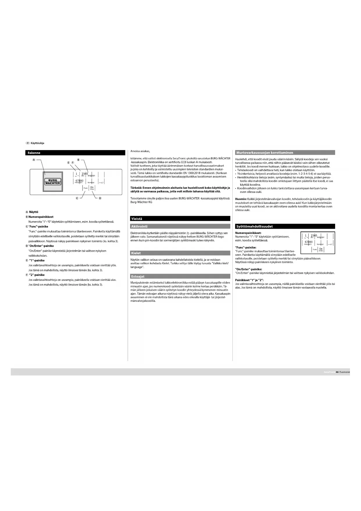 Huomlo: Kaiki järjestemvalvovjan koodin, tehtaskoodin ja käytäjkoodin muutokset on tehtva kassakaapin olen osaali kuni Kuk luktkojärjestelmän on muutetu uusi koodi, se on aktiviota vuaudella koodilla morta kertaa oen osaali kuu.