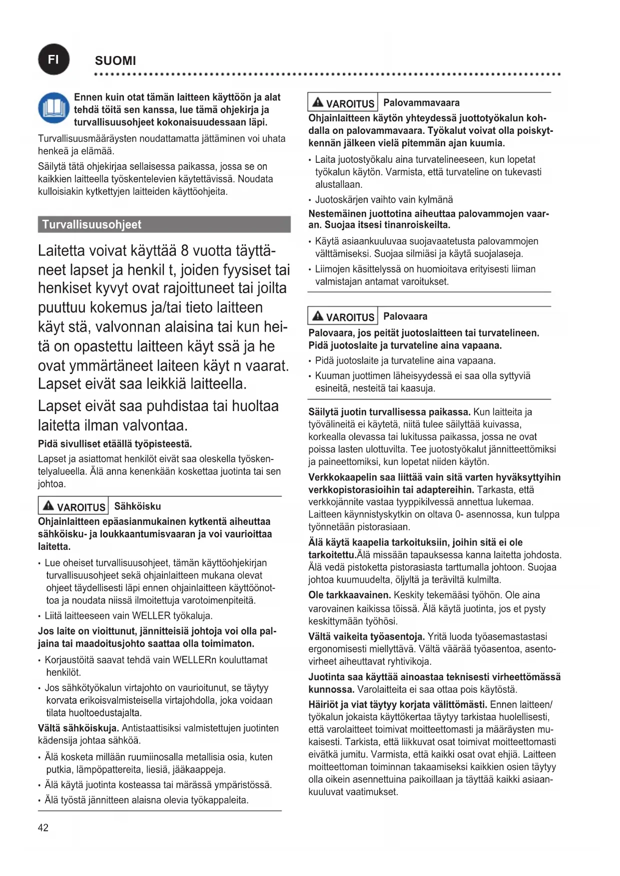 - LiitälaitteeseenvainWELLERtyökaluja. Jos laite on vioittunut, jännitteisiä johtoja voi olla pal- jaina tai maadoitusjohto saattaa olla toimimaton.