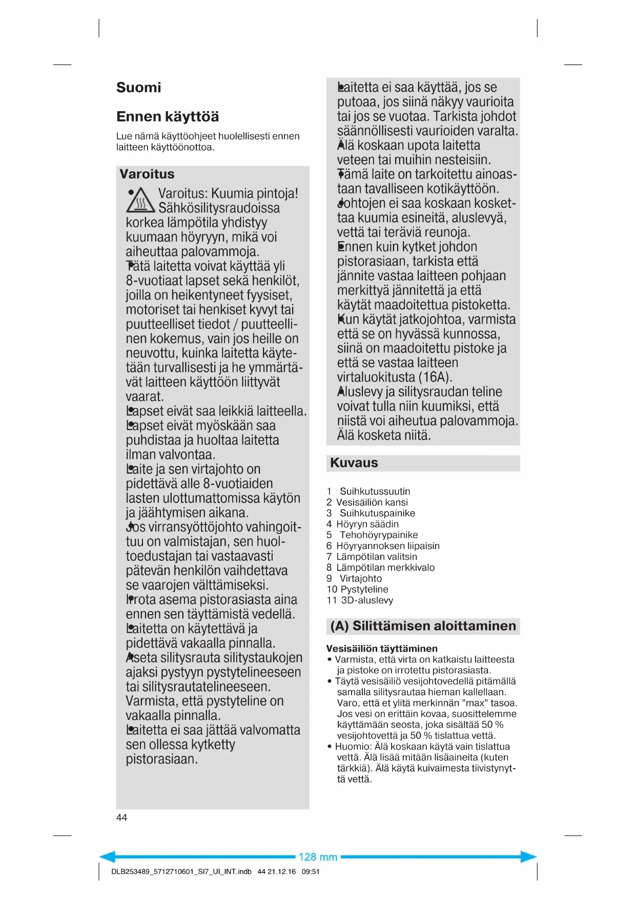 DLB253489_5712710601_SI7_UI_INT.indb 43 21.12.16 09:51Suomi Ennen käyttöä Lue nämä käyttöohjeet huolellisesti ennen laitteen käyttöönottoa. Varoitus
