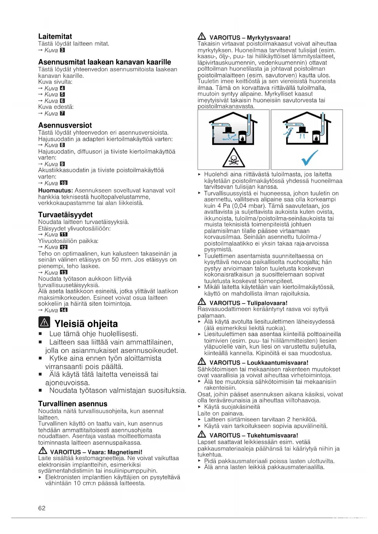 Elektronisten implanttien käyttäjien on pysyteltävä vähintään 10cm:n päässä laitteesta. VAROITUS‒Myrkytysvaara! Takaisin virtaavat poistoilmakaasut voivat aiheuttaa myrkytyksen. Huoneilmaa tarvitsevat tulisijat (esim. kaasu-, öljy-, puu- tai hiilikäyttöiset lämmityslaitteet, läpivirtauskuumennin, vedenkuumennin) ottavat polttoilman huonetilasta ja johtavat poistoilman poistoilmalaitteen (esim. savutorven) kautta ulos. Tuuletin imee keittiöstä ja sen viereisistä huoneista ilmaa. Tämä on korvattava riittävällä tuloilmalla, muutoin syntyy alipaine. Myrkylliset kaasut imeytyisivät takaisin huoneisiin savutorvesta tai poistoilmakanavasta.