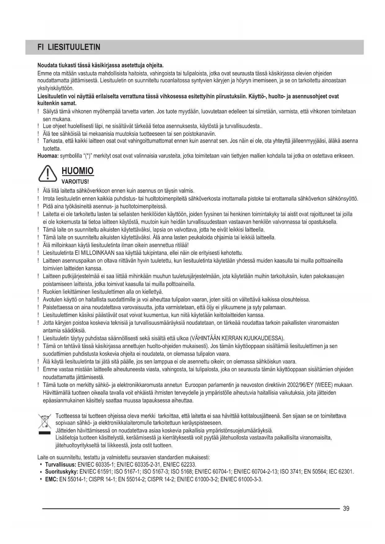 Kubu tuleb korrapäraselt seest ja väljast puhastada (vähemalt sama sageli, kui te rasvafiltrit hooldate). Kasutage puhastamiseks neutraalses pesuvedelikus niisutatud lappi. Ärge kasutage abrasiivseid vahendeid. ALKOHOLI EI TOHI KASUTADA! HOIATUS!Kui kubu vastavalt soovitustele ei puhastata ja filtreid ei asendata, võib tekkida põlengu oht. Seetõttu soovitame juhtnööre järgida. Tootja ei vastuta mootori kahjustuste ega põlengute eest, kui nende põhjuseks on val e hooldamine või eespool kirjeldatud ohutussoovituste eiramine. Rasvafilter Püüab kinni toidu valmistamisel tekkivad rasvaosakesed. Rasvafiltrit peab puhastama kord kuus nõrgatoimelise pesuvahendiga või käsitsi või nõudepesumasinas madalal temperatuuril ja kasutades lühikest tsüklit. Nõudepesumasinas pesemisel võib rasvafilter veidi värvi muuta, kuid see ei mõjuta selle filtrimisomadusi. Rasvafiltri eemaldamiseks tõmmake vedruga vabastushooba. Söefilter (ainult filtriga versioon) Imeb toiduvalmistamisel tekkivaid ebameeldivaid lõhnasid. Pikemaajalisel kasutamisel söefilter ummistub, sõltuvalt toiduvalmistamise viisidest ja rasvafiltri puhastamise sagedusest. Igal juhul tuleb salv vähemalt kord nelja kuu jooksul välja vahetada. Söefiltrit EI TOHI pesta ega regenereerida. Tsirkulaarne söefilter Kasutada kummalgi küljel mootori tiiviku kaitsevõrgu kattena, seejärel pöörata päripäeva. Lahtimonteerimiseks pöörata vastupäeva. Asenduslambid Pliidikubu on varustatud LED-tehnoloogial põhineva valgustussüsteemiga. LED-lambid tagavad optimaalse valgustuse ja kestavad tavapäraste pirnidega võrreldes kuni 10 korda kauem ning võimaldavad säästa 90% elektrienergiast. Valgustussüsteemi talitlushäire korral võtke ühendust tehnilise teenistusega.FI LIESITUULETIN Noudata tiukasti tässä käsikirjassa asetettuja ohjeita. Emme ota mitään vastuuta mahdollisista haitoista, vahingoista tai tulipaloista, jotka ovat seurausta tässä käsikirjassa olevien ohjeiden noudattamatta jättämisestä. Liesituuletin on suunniteltu ruoanlaitossa syntyvien käryjen ja höyryn imemiseen, ja se on tarkoitettu ainoastaan yksityiskäyttöön. ! Säilytä tämä vihkonen myöhempää tarvetta varten. Jos tuote myydään, luovutetaan edelleen tai siirretään, varmista, että vihkonen toimitetaan sen mukana. ! Lue ohjeet huolellisesti läpi, ne sisältävät tärkeää tietoa asennuksesta, käytöstä ja turvallisuudesta.. ! Älä tee sähköisiä tai mekaanisia muutoksia tuotteeseen tai sen poistokanaviin. ! Tarkasta, että kaikki laitteen osat ovat vahingoittumattomat ennen kuin asennat sen. Jos näin ei ole, ota yhteyttä jälleenmyyjääsi, äläkä asenna tuotetta. Liesituuletin voi näyttää erilaiselta verrattuna tässä vihkosessa esitettyihin piirustuksiin. Käyttö-, huolto- ja asennusohjeet ovat kuitenkin samat. Huomaa: symbolilla “(*)” merkityt osat ovat valinnaisia varusteita, jotka toimitetaan vain tiettyjen mallien kohdalla tai jotka on ostettava erikseen. Laite on suunniteltu, testattu ja valmistettu seuraavien standardien mukaisesti: Turvallisuus: EN/IEC 60335-1; EN/IEC 60335-2-31, EN/IEC 62233. Suorituskyky: EN/IEC 61591; ISO 5167-1; ISO 5167-3; ISO 5168; EN/IEC 60704-1; EN/IEC 60704-2-13; ISO 3741; EN 50564; IEC 62301. EMC: EN 55014-1; CISPR 14-1; EN 55014-2; CISPR 14-2; EN/IEC 61000-3-2; EN/IEC 61000-3-3. HUOMIO VAROITUS! Tuotteessa tai tuotteen ohjeissa oleva merkki tarkoittaa, että laitetta ei saa hävittää kotitalousjätteenä. Sen sijaan se on toimitettava sopivaan sähkö- ja elektroniikkalaiteromulle tarkoitettuun keräyspisteeseen. Jätteiden hävittämisessä on noudatettava asiaa koskevia paikallisia ympäristönsuojelumääräyksiä. Lisätietoja tuotteen käsittelystä, keräämisestä ja kierrätyksestä voit pyytää jätehuollosta vastaavilta paikallisilta viranomaisilta, jätehuoltoyritykseltä tai liikkeestä, josta ostit tuotteen. ! Älä liitä laitetta sähköverkkoon ennen kuin asennus on täysin valmis. ! Irrota liesituuletin ennen kaikkia puhdistus- tai huoltotoimenpiteitä sähköverkosta irrottamalla pistoke tai erottamalla sähköverkon sähkönsyöttö. ! Pidä aina työkäsineitä asennus- ja huoltotoimenpiteissä. ! Laitetta ei ole tarkoitettu lasten tai sellaisten henkilöiden käyttöön, joiden fyysinen tai henkinen toimintakyky tai aistit ovat rajoittuneet tai joilla ei ole kokemusta tai tietoa laitteen käytöstä, muutoin kuin heidän turvallisuudestaan vastaavan henkilön valvonnassa tai opastuksella. ! Tämä laite on suunniteltu aikuisten käytettäväksi, lapsia on valvottava, jotta he eivät leikkisi laitteella. ! Tämä laite on suunniteltu aikuisten käytettäväksi. Älä anna lasten peukaloida ohjaimia tai leikkiä laitteella. ! Älä milloinkaan käytä liesituuletinta ilman oikein asennettua ritilää! ! Liesituuletinta EI MILLOINKAAN saa käyttää tukipintana, ellei näin ole erityisesti kehotettu. ! Laitteen asennuspaikan on oltava riittävän hyvin tuuletettu, kun liesituuletinta käytetään yhdessä muiden kaasulla tai muilla polttoaineilla toimivien laitteiden kanssa. ! Laitteen putkijärjestelmää ei saa liittää mihinkään muuhun tuuletusjärjestelmään, jota käytetään muihin tarkoituksiin, kuten pakokaasujen poistamiseen laitteista, jotka toimivat kaasulla tai muilla polttoaineilla. ! Ruokien liekittäminen liesituulettimen alla on kiellettyä. ! Avotulen käyttö on haitallista suodattimille ja voi aiheuttaa tulipalon vaaran, joten siitä on vältettävä kaikissa olosuhteissa. ! Paistettaessa on aina noudatettava varovaisuutta, jotta varmistetaan, että öljy ei ylikuumene ja syty palamaan. ! Liesituulettimen käsiksi päästävät osat voivat kuumentua, kun niitä käytetään keittolaitteiden kanssa. ! Jotta käryjen poistoa koskevia teknisiä ja turvallisuusmääräyksiä noudatetaan, on tärkeää noudattaa tarkoin paikallisten viranomaisten antamia säädöksiä. ! Liesituuletin täytyy puhdistaa säännöllisesti sekä