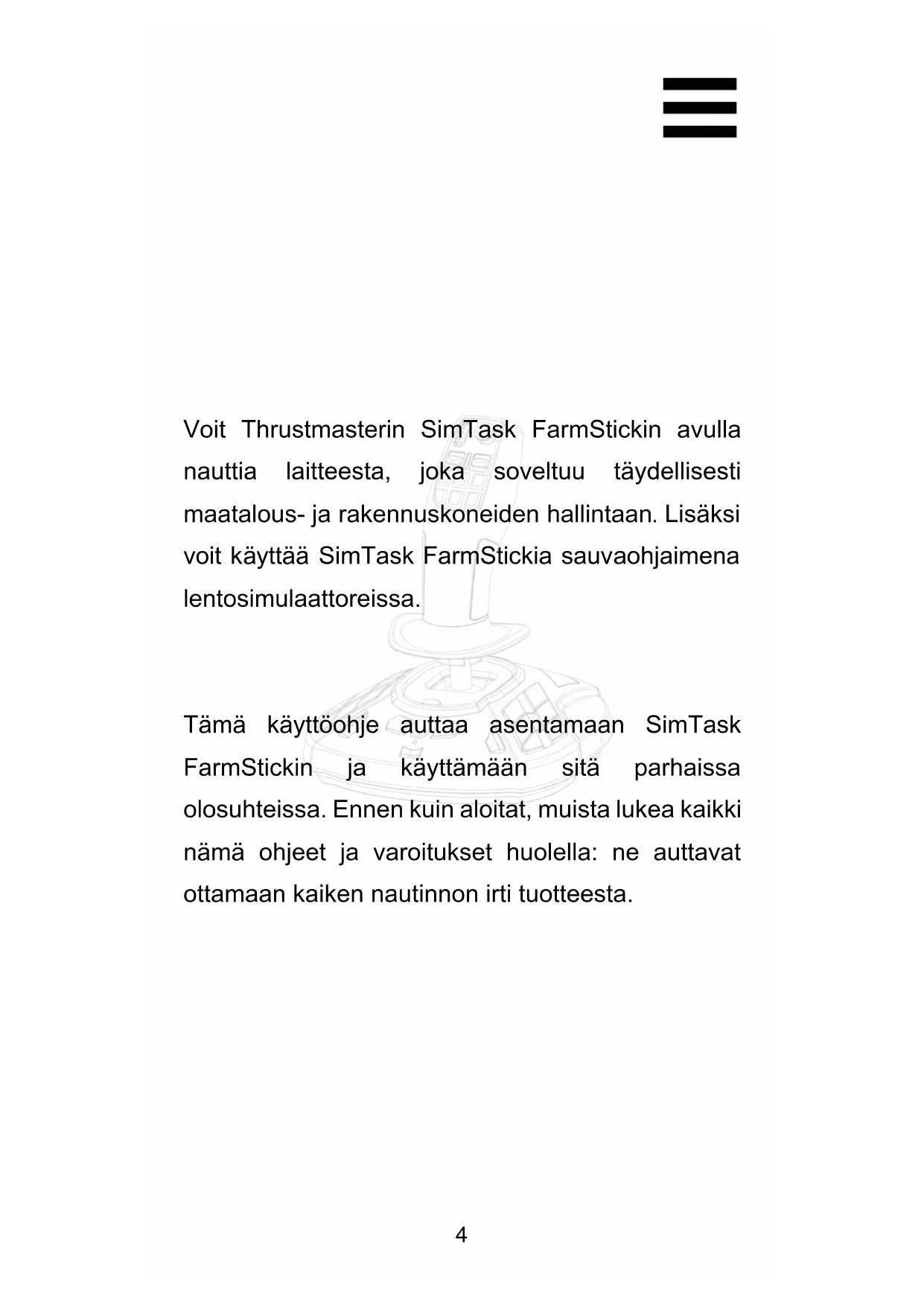 Tämä käyttöohje auttaa asentamaan SimTask FarmStickin ja käyttämään sitä parhaissa olosuhteissa. Ennen kuin aloitat, muista lukea kaikki nämä ohjeet ja varoitukset huolella: ne auttavat ottamaan kaiken nautinnon irti tuotteesta.5