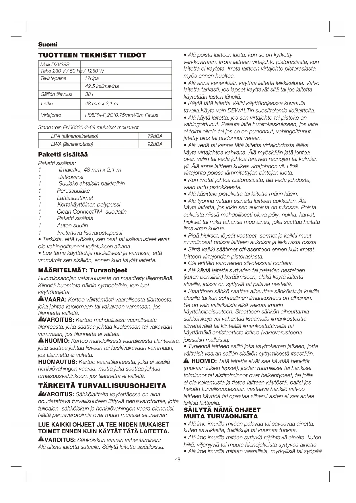 Teho 230 V / 50 Hz / 1250 W 17Kpa 38 l 48 mm x 2,1 m 79dBA H05RN-F,2C*0.75mm²/3m.Pituus Tiivistepaine 42,5 l/sIlmavirta Säiliön tilavuus Letku LPA (äänenpainetaso) LWA (äänitehotaso) 92dBA Virtajohto Standardin EN60335-2-69 mukaiset meluarvot Huomiosanojen vakavuusaste on määritelty jäljempänä. Kiinnitä huomiota näihin symboleihin, kun luet käyttöohjetta. VAARA: Kertoo välittömästi vaarallisesta tilanteesta, joka johtaa kuolemaan tai vakavaan vammaan, jos tilannetta vältetä. VAROITUS: Kertoo mahdollisesti vaarallisesta tilanteesta, joka saattaa johtaa kuolemaan tai vakavaan vammaan, jos tilannetta ei vältetä. HUOMIO: Kertoo mahdollisesti vaarallisesta tilanteesta, joka saattaa johtaa lievään tai keskivakavaan vammaan, jos tilannetta ei vältetä. HUOMAUTUS: Kertoo vaaratilanteesta, joka ei sisällä henkilövahingon vaaraa, mutta joka saattaa johtaa omaisuusvahinkoon, jos tilannetta ei vältetä. VAROITUS: Sähkölaitteita käytettäessä on aina noudatettava turvallisuuteen liittyviä perusvarotoimia, jotta tulipalon, sähköiskun ja henkilövahingon vaara pienenisi. Näitä perusvarotoimia ovat muun muassa seuraavat: VAROITUS: Sähköiskun vaaran vähentäminen: Älä altista laitetta sateelle. Säilytä laitetta sisätiloissa. HUOMIO: Tätä laitetta eivät saa käyttää henkilöt (mukaan lukien lapset), joiden ruumiilliset tai henkiset toiminnot tai aistitoiminnot ovat heikentyneet, tai joilla ei ole kokemusta ja tietoa laitteen käytöstä, paitsi jos heidän turvallisuudestaan vastaava henkilö valvoo laitteen käyttöä tai opastaa siihen.Lasten ei saa antaa leikkiä laitteella.