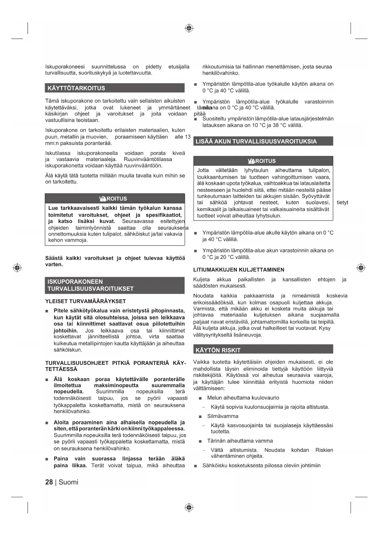 Tämä iskuporakone on tarkoitettu vain sellaisten aikuisten Nl\WHWWlYlNVL MRWND RYDW OXNHQHHW MD \PPlUWlQHHW WlPlQ NlVLNLUMDQ RKMHHW MD YDURLWXNVHW MD MRLWD YRLGDDQ SLWll vastuullisina teoistaan. Iskuporakone on tarkoitettu erilaisten materiaalien, kuten SXXQPHWDOOLQMDPXRYLHQ SRUDDPLVHHQNl\WWlHQ DOOH mm:n paksuista poranterää. Iskutilassa iskuporakoneella voidaan porata kiveä MD YDVWDDYLD PDWHULDDOHMD 5XXYLQYllQW|WLODVVD iskuporakonetta voidaan käyttää ruuvinvääntöön. Älä käytä tätä tuotetta millään muulla tavalla kuin mihin se on tarkoitettu. VAROITUS Lue tarkkaavaisesti kaikki tämän työkalun kanssa toimitetut varoitukset, ohjeet ja spesifikaatiot, ja katso lisäksi kuvat. 6HXUDDYDVVD HVLWHWW\MHQ RKMHLGHQ ODLPLQO\|QQLVWl VDDWWDD ROOD VHXUDXNVHQD RQQHWWRPXXNVLDNXWHQWXOLSDORWVlKN|LVNXWMDWDLYDNDYLD NHKRQYDPPRMD Säästä kaikki varoitukset ja ohjeet tulevaa käyttöä varten. ISKUPORAKONEEN TURVALLISUUSVAROITUKSET