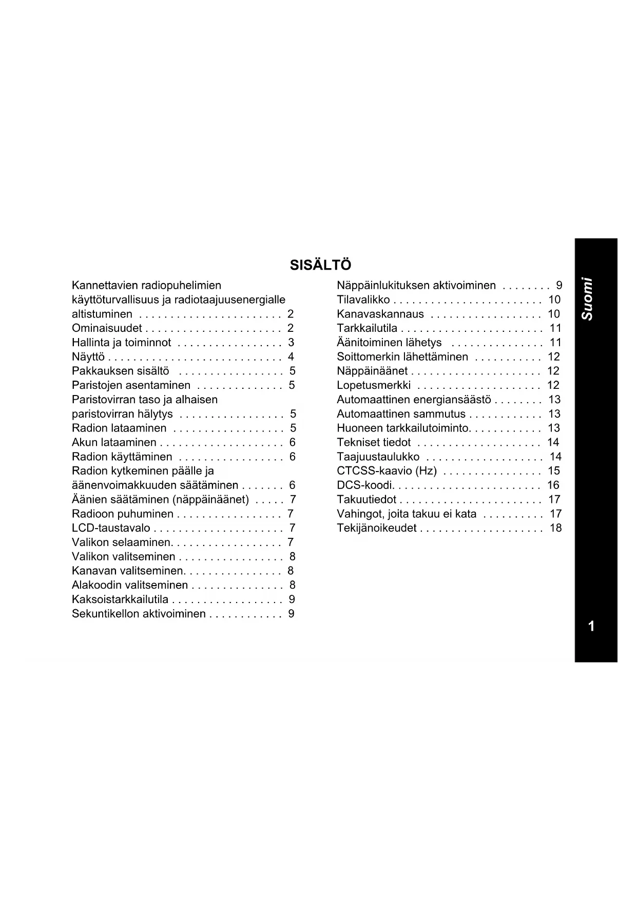Kannettavien radiopuhelimien käyttöturvallisuus ja radiotaajuusenergialle altistuminen HUOMAUTUS! Lue ennen tämän tuotteen käyttöä sen mukana toimitetun "Tuoteturvallisuus ja radiotaajuiselle energialle altistuminen" -esitteen sisältämät radiotaajuusenergiaa koskevat ohjeet ja käyttöohjeet varmistaaksesi, että radiotaajuusenergian altistusrajoja noudatetaan. Ominaisuudet