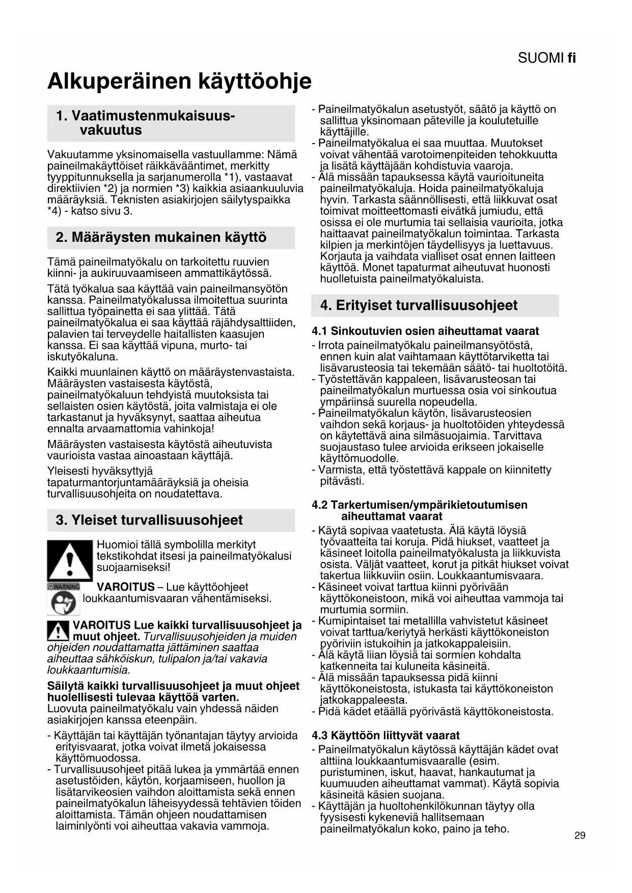 Alkuperäinen käyttöohje Vakuutamme yksinomaisella vastuullamme: Nämä paineilmakäyttöiset räikkävääntimet, merkitty tyyppitunnuksella ja sarjanumerolla *1), vastaavat direktiivien *2) ja normien *3) kaikkia asiaankuuluvia määräyksiä. Teknisten asiakirjojen säilytyspaikka *4) - katso sivu 3. Tämä paineilmatyökalu on tarkoitettu ruuvien kiinni- ja aukiruuvaamiseen ammattikäytössä. Tätä työkalua saa käyttää vain paineilmansyötön kanssa. Paineilmatyökalussa ilmoitettua suurinta sallittua työpainetta ei saa ylittää. Tätä paineilmatyökalua ei saa käyttää räjähdysalttiiden, palavien tai terveydelle haitallisten kaasujen kanssa. Ei saa käyttää vipuna, murto- tai iskutyökaluna. Kaikki muunlainen käyttö on määräystenvastaista. Määräysten vastaisesta käytöstä, paineilmatyökaluun tehdyistä muutoksista tai sellaisten osien käytöstä, joita valmistaja ei ole tarkastanut ja hyväksynyt, saattaa aiheutua ennalta arvaamattomia vahinkoja! Määräysten vastaisesta käytöstä aiheutuvista vaurioista vastaa ainoastaan käyttäjä. Yleisesti hyväksyttyjä tapaturmantorjuntamääräyksiä ja oheisia turvallisuusohjeita on noudatettava. Huomioi tällä symbolilla merkityt tekstikohdat itsesi ja paineilmatyökalusi suojaamiseksi! VAROITUS – Lue käyttöohjeet loukkaantumisvaaran vähentämiseksi. VAROITUS Lue kaikki turvallisuusohjeet ja muut ohjeet. Turvallisuusohjeiden ja muiden ohjeiden noudattamatta jättäminen saattaa aiheuttaa sähköiskun, tulipalon ja/tai vakavia loukkaantumisia. Säilytä kaikki turvallisuusohjeet ja muut ohjeet huolellisesti tulevaa käyttöä varten. Luovuta paineilmatyökalu vain yhdessä näiden asiakirjojen kanssa eteenpäin. - Käyttäjän tai käyttäjän työnantajan täytyy arvioida erityisvaarat, jotka voivat ilmetä jokaisessa käyttömuodossa. - Turvallisuusohjeet pitää lukea ja ymmärtää ennen asetustöiden, käytön, korjaamiseen, huollon ja lisätarvikeosien vaihdon aloittamista sekä ennen paineilmatyökalun läheisyydessä tehtävien töiden aloittamista. Tämän ohjeen noudattamisen laiminlyönti voi aiheuttaa vakavia vammoja. - Paineilmatyökalun asetustyöt, säätö ja käyttö on sallittua yksinomaan päteville ja koulutetuille käyttäjille. - Paineilmatyökalua ei saa muuttaa. Muutokset voivat vähentää varotoimenpiteiden tehokkuutta ja lisätä käyttäjään kohdistuvia vaaroja. - Älä missään tapauksessa käytä vaurioituneita paineilmatyökaluja. Hoida paineilmatyökaluja hyvin. Tarkasta säännöllisesti, että liikkuvat osat toimivat moitteettomasti eivätkä jumiudu, että osissa ei ole murtumia tai sellaisia vaurioita, jotka haittaavat paineilmatyökalun toimintaa. Tarkasta kilpien ja merkintöjen täydellisyys ja luettavuus. Korjauta ja vaihdata vialliset osat ennen laitteen käyttöä. Monet tapaturmat aiheutuvat huonosti huolletuista paineilmatyökaluista.