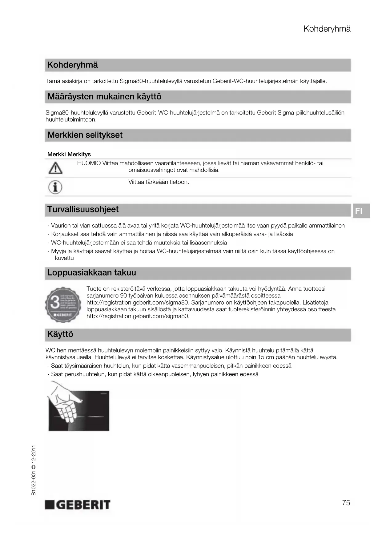 Tämä asiakirja on tarkoitettu Sigma80-huuhtelulevyllä varustetun Geberit-WC-huuhtelujärjestelmän käyttäjälle. Sigma80-huuhtelulevyllä varustettu Geberit-WC-huuhtelujärjestelmä on tarkoitettu Geberit Sigma-piilohuuhtelusäiliön huuhtelutoimintoon. - Vaurion tai vian sattuessa älä avaa tai yritä korjata WC-huuhtelujärjestelmää itse vaan pyydä paikalle ammattilainen - Korjaukset saa tehdä vain ammattilainen ja niissä saa käyttää vain alkuperäisiä vara- ja lisäosia - WC-huuhtelujärjestelmään ei saa tehdä muutoksia tai lisäasennuksia - Myyjä ja käyttäjä saavat käyttää ja hoitaa WC-huuhtelujärjestelmää vain niiltä osin kuin tässä käyttöohjeessa on kuvattu Tuote on rekisteröitävä verkossa, jotta loppuasiakkaan takuuta voi hyödyntää. Anna tuotteesi sarjanumero 90 työpäivän kuluessa asennuksen päivämäärästä osoitteessa http://registration.geberit.com/sigma80. Sarjanumero on käyttöohjeen takapuolella. Lisätietoja loppuasiakkaan takuun sisällöstä ja kattavuudesta saat tuoterekisteröinnin yhteydessä osoitteesta http://registration.geberit.com/sigma80. WC:hen mentäessä huuhtelulevyn molempiin painikkeisiin syttyy valo. Käynnistä huuhtelu pitämällä kättä käynnistysalueella. Huuhtelulevyä ei tarvitse koskettaa. Käynnistysalue ulottuu noin 15 cm päähän huuhtelulevystä. - Saat täysimääräisen huuhtelun, kun pidät kättä vasemmanpuoleisen, pitkän painikkeen edessä - Saat perushuuhtelun, kun pidät kättä oikeanpuoleisen, lyhyen painikkeen edessä Kohderyhmä Määräysten mukainen käyttö Merkkien selitykset Merkki Merkitys HUOMIO Viittaa mahdolliseen vaaratilanteeseen, jossa lievät tai hieman vakavammat henkilö- tai omaisuusvahingot ovat mahdollisia. Viittaa tärkeään tietoon. Turvallisuusohjeet Loppuasiakkaan takuu Käyttö76 Asetukset B1022-001 © 12-2011 Sigma80-huuhtelulevyllä varustettuun Geberit-WC-huuhtelujärjestelmään voidaan tehdä tiettyjä asetuksia. Saat ohjeita asetuksiin seuraavilta sivuilta. Yleiskuva Sigma80-huuhtelulevyllä varustettuun Geberit-WC-huuhtelujärjestelmään voidaan tehdä lisäasetuksia. Jos haluat muuttaa jotain seuraavan taulukon asetuksista, ota yhteyttä ammattilaiseen. Asetukset Asetus Kuvaus Tehdasasetus A Puhdistustoiminnon ottaminen käyttöön ja pois käytöstä Huuhtelulevy ja WC voidaan puhdistaa käynnistämättä huuhtelua. Voit ottaa puhdistustoiminnon käyttöön ja puhdistuksen jälkeen pois käytöstä. Puhdistustoiminto menee automaattisesti pois päältä 3 min. kuluttua.