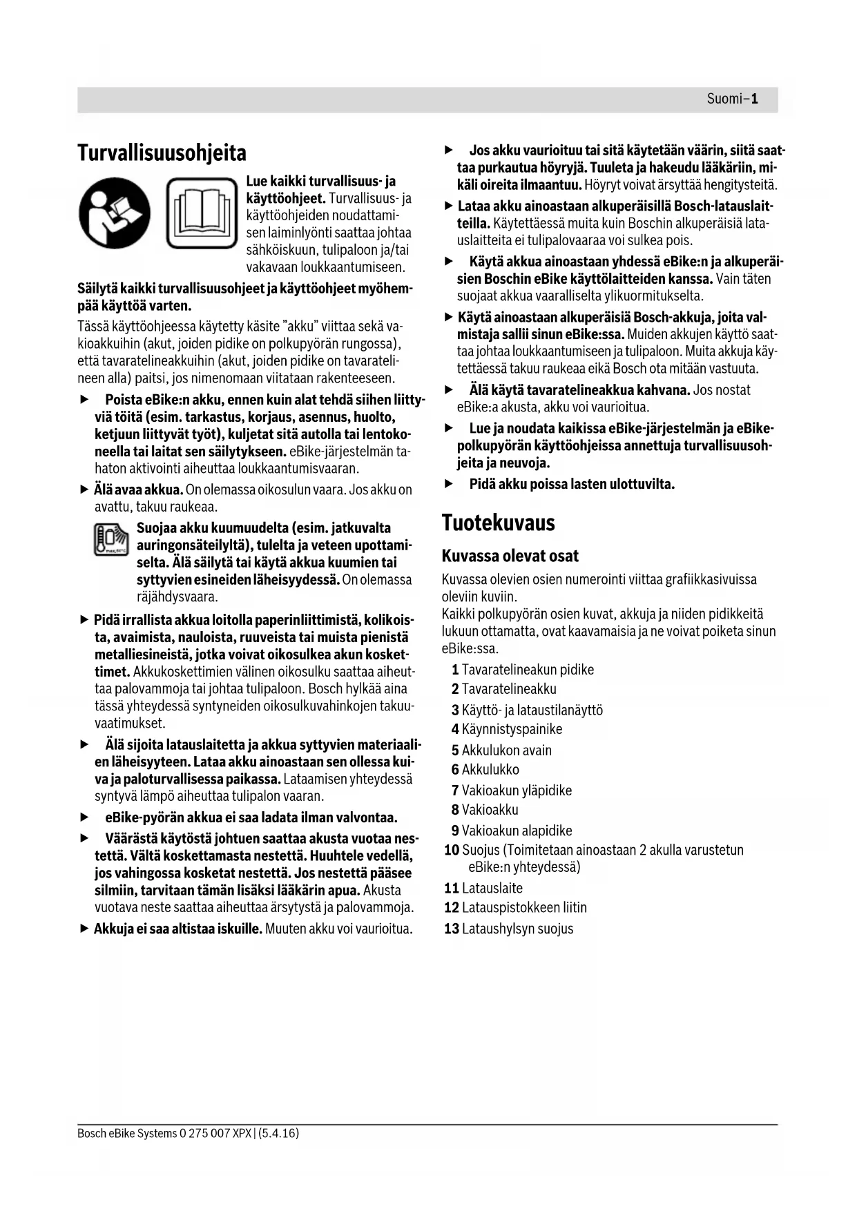 Nimellisjännite V= 36 36 36 Nimellinen kapasiteetti Ah 8,2 11 13,4 Energia Wh 300 400 500 Käyttölämpötila °C –10...+40 –10...+40 –10...+40 Varastointilämpötila °C –10...+60 –10...+60 –10...+60 Sallittu latauslämpötila-alue °C 0...+40 0...+40 0...+40 Paino n. kg 2,0/2,4 2,5/2,6 2,6/2,7 Suojaus IP 54 (pöly- ja roiskevesisuojattu) IP 54 (pöly- ja roiskevesisuojattu) IP 54 (pöly- ja roiskevesisuojattu)Suomi–3 Bosch eBike Systems 0 275 007 XPX | (5.4.16) Kahden akun käyttö yhdessä eBike:ssa (valinnainen) eBike voi olla varustettu myös kahdella akulla valmistajan toi- mesta. Tällaisessa tapauksessa toiseen latausliitäntään ei pääse käsiksi tai polkupyörän valmistaja on sulkenut sen sul- kutulpalla. Lataa akut ainoastaan siitä latausliitännästä, johon pääsee käsiksi. Älä milloinkaan avaa valmistajan sulkemaa latauslii- täntää. Aiemmin suljettuna olleesta latausliitännästä la- taaminen voi johtaa peruuttamattomiin vaurioihin. Jos haluat käyttää kahdella akulla käytettäväksi tarkoitettua eBike:a vain yhdellä akulla, peitä vapaan liitännän kosketti- met mukana toimitetulla suojuksella 10, muutoin on olemassa oikosulun vaara avoimien koskettimien johdosta (katso kuvat A ja B). Lataaminen kahden akun ollessa asennettuna Jos eBike:en on kiinnitetty kaksi akkua, voidaan molemmat akut ladata peittämättömän liitännän kautta. Latauksen aika- na akkuja ladataan vuorotellen siten, että järjestelmä vaihtaa useamman kerran automaattisesti ladattavien akkujen välillä. Latausajat lasketaan yhteen. Käytön aikana molemmat akut myös tyhjenevät vuorotellen. Jos poistat akut pidikkeistä, voit ladata molempia akkuja yksitellen. Lataaminen yhden akun ollessa asennettuna Jos asennettuna on vain yksi akku, voit ladata polkupyörässä vain sen akun, jonka latausliitäntään pääsee käsiksi. Akun, jonka latausliitäntä on suljettu, voit ladata ainoastaan ottamal- la akun pois pidikkeestä. Akun asennus ja irrotus (katsokuvat A–B) Kytke akku ja eBike-järjestelmä aina pois päältä asetta- essasi akun pidikkeeseen tai poistaessasi sen siitä. Jotta akku voidaan asentaa, on avaimen 5 oltava lukossa 6 ja lukon oltava avattuna. Asenna vakioakku 8 koskettimet edellä eBike:n alapidikkee- seen 9 (akku voi olla enintään 7° verran kallellaan runkoon nähden). Käännä se vasteeseen asti yläpidikkeeseen 7. Asenna tavaratelineakku 2 työntämällä se koskettimet edel- lä vasteeseen asti tavaratelineen pidikkeeseen 1. Tarkista, että akku on tiukasti paikallaan. Lukitse aina akku lu- kolla 6, koska lukko muuten saattaa aueta ja akku voi pudota pidikkeestä. Poista aina avain 5 lukosta 6 lukitsemisen jälkeen. Täten estät avaimen putoamasta ja sen, että sivullinen luvattomasti irrot- taa akun pysäköidystä polkupyörästä. Kun haluat irrottaa vakioakun 8, kytke se pois päältä ja avaa lukko avaimella 5. Käännä akku yläpidikkeestä 7 irti ja vedä se pois alapidikkeestä 9. Irrota tavaratelineakku 2 kytkemällä se pois päältä ja avaa- malla lukko avaimella 5. Vedä akku ulos pidikkeestä 1. Käyttö Käyttöönotto Käytä ainoastaan alkuperäisiä Bosch-akkuja, joita val- mistaja sallii sinun eBike:ssa. Muiden akkujen käyttö saattaa johtaa loukkaantumiseen ja tulipaloon. Muita akku- ja käytettäessä takuu raukeaa eikä Bosch ota mitään vas- tuuta. Käynnistys ja pysäytys Akun päällekytkentä on yksi niistä mahdollisuuksista, joilla eBike-järjestelmä voidaan kytkeä päälle. Lue käyttövoimayk- sikön ja ajotietokoneen käyttöohjeet ja noudata niitä. Tarkista ennen akun tai eBike-järjestelmän käynnistämistä, että lukko 6 on lukittuna. Kytke akku painamalla käynnistyspainiketta 4. Näytön 3 LED:it syttyvät ja näyttävät samalla varaustilan. Huomio: Jos akun kapasiteetti on alle 5 %, akussa ei pala yh- tään lataustilanäytön 3 LED:iä. Ainoastaan ajotietokoneesta voidaan nähdä, onko eBike-järjestelmä päällekytkettynä. Kytke pois akku painamalla käynnistyspainiketta 4 uudel- leen. Näytön 3 LED:it sammuvat. Myös eBike-järjestelmä on tällöin poiskytkettynä. Mikäli noin 10 minuuttiin ei käytetä eBike-moottoria (esim. koska eBike seisoo paikallaan) tai paineta mitään eBike:n ajo- tietokoneen tai käyttöyksikön painiketta, eBike-järjestelmä ja siten myös akku kytkeytyvät energian säästämiseksi auto- maattisesti pois päältä. ”Elektroninen kennojen suojaus (ECP)” suojaa akkua syväpur- kaukselta, ylilataukselta, ylikuumenemiselta ja oikosululta. Vaaratilanteessa akku kytkeytyy automaattisesti pois suoja- kytkennän avulla. Jos akussa todetaan vika, va- raustilan näytön 3 kaksi LED:iä vilkkuu. Käänny tällöin valtuute- tun polkupyöräkauppiaan puo- leen. Ohjeita akun optimaaliseen käsittelyyn Akun elinikää voidaan pidentää, jos se hoidetaan hyvin ja etenkin, jos se varastoidaan oikeassa lämpötilassa. Ikääntymisen myötä akun kapasiteetti pienenee kuitenkin myös oikein hoidettuna. Huomattavasti lyhentynyt käyttöaika latauksen jälkeen osoit- taa, että akku on loppuun käytetty. Voit vaihtaa akkua.Suomi–4 0 275 007 XPX | (5.4.16) Bosch eBike Systems Akun lataus ennen varastointia ja sen aikana Lataa akku ennen pitkää käyttötaukoa noin 60 % kapasiteet- tiin (3 ... 4 LED:iä palaa lataustilan näytössä 3). Tarkista varaustilanne 6 kuukauden jälkeen. Jos lataustilan näytössä 3 palaa enää yksi LED, lataa akku uudelleen n. 60 % kapasiteettiin. Huomio: Jos akku säilytetään kauan tyhjänä, saattaa se pie- nestä itsepurkauksesta huolimatta vaurioitua, jolloin varaus- kyky pienenee huomattavasti. Ei ole suositeltavaa pitää akkua jatkuvasti kytkettynä lataus- laitteeseen. Varastointivaatimukset Säilytä akku mahdollisuuksien mukaan kuivassa, hyvin tuule- tetussa tilassa. Suojaa akku kosteudelta ja vedeltä. Epäsuo- tuisissa sääolosuhteissa on esim. suositeltavaa irrottaa akku eBike:sta ja säilyttää se suljetussa tilassa seuraava