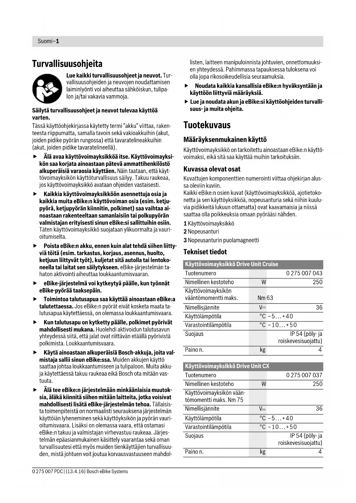 - Motoreffekten kan avvike ved enkelte utførelser. OBJ_BUCH-2821-001.book Page 3 Wednesday, April 13, 2016 4:38 PMNorsk–4 Bosch eBike Systems 0 275 007 PDC | (13.4.16) Service og vedlikehold Vedlikehold og rengjøring Ved bytte av lyspærer må du kontrollere at lyspærene er kom- patible med Bosch eBike-systemet (spør sykkelforhandleren) og at spenningen er riktig. Det må bare brukes lyspærer med samme spenning. Ingen komponenter må senkes ned i vann eller rengjøres med høytrykksspyler. Dette gjelder også drivenheten. Få inspisert eBike-systemet teknisk minst en gang i året (f.eks. mekanisk og om systemprogramvaren er oppdatert). Til service og reparasjon av el-sykkelen henvender du deg til en autorisert sykkel-forhandler. Kundeservice og rådgivning ved bruk Ved alle spørsmål til el-sykkel-systemet og dets komponen- ter, ta kontakt med en autorisert sykkelforhandler. Kontaktinformasjoner til autoriserte sykkelforhandlere finner du på internettsiden www.bosch-ebike.com Deponering Drivenheten, kjørecomputeren inkl. betjeningsenhe- ten, batteriet, hastighetssensoren, tilbehør og embal- lasje skal leveres til gjenvinning. El-sykkelen og deres komponenter må ikke kastes i vanlig søppel! Kun for EU-land: Iht. det europeiske direktivet 2012/19/EU om gamle elektriske apparater og iht. det europeiske direktivet 2006/66/EC må defekte eller opp- brukte batterier/oppladbare batterier samles inn adskilt og leveres inn til en miljøvennlig resirkule- ring. Rett til endringer forbeholdes. OBJ_BUCH-2821-001.book Page 4 Wednesday, April 13, 2016 4:38 PMSuomi–1 0 275 007 PDC | (13.4.16) Bosch eBike Systems Turvallisuusohjeita Lue kaikki turvallisuusohjeet ja neuvot. Tur- vallisuusohjeiden ja neuvojen noudattamisen laiminlyönti voi aiheuttaa sähköiskun, tulipa- lon ja/tai vakavia vammoja. Säilytä turvallisuusohjeet ja neuvot tulevaa käyttöä varten. Tässä käyttöohjekirjassa käytetty termi ”akku” viittaa, raken- teesta riippumatta, samalla tavoin sekä vakioakkuihin (akut, joiden pidike pyörän rungossa) että tavaratelineakkuihin (akut, joiden pidike tavaratelineellä). Älä avaa käyttövoimayksikköä itse. Käyttövoimayksi- kön saa korjata ainoastaan pätevä ammattihenkilöstö alkuperäisiä varaosia käyttäen. Näin taataan, että käyt- tövoimayksikön käyttöturvallisuus säilyy. Takuu raukeaa, jos käyttövoimayksikkö avataan ohjeiden vastaisesti. Kaikkia käyttövoimayksikköön asennettuja osia ja kaikkia muita eBike:n käyttövoiman osia (esim. ketju- pyörä, ketjupyörän kiinnitin, polkimet) saa vaihtaa ai- noastaan rakenteeltaan samanlaisiin tai polkupyörän valmistajan erityisesti sinun eBike:si sallittuihin osiin. Täten käyttövoimayksikkö suojataan ylikuormalta ja vauri- oitumiselta. Poista eBike:n akku, ennen kuin alat tehdä siihen liitty- viä töitä (esim. tarkastus, korjaus, asennus, huolto, ketjuun liittyvät työt), kuljetat sitä autolla tai lentoko- neella tai laitat sen säilytykseen. eBike-järjestelmän ta- haton aktivointi aiheuttaa loukkaantumisvaaran. eBike-järjestelmä voi kytkeytyä päälle, kun työnnät eBike-pyörää taaksepäin. Toimintoa talutusapua saa käyttää ainoastaan eBike:a talutettaessa. Jos eBike:n pyörät eivät kosketa maata ta- lutusapua käytettäessä, on olemassa loukkaantumisvaara. Kun talutusapu on kytketty päälle, polkimet pyörivät mahdollisesti mukana. Huolehdi aktivoidun talutusavun yhteydessä siitä, että jalat ovat riittävän etäällä pyörivistä polkimista. Loukkaantumisvaara. Käytä ainoastaan alkuperäisiä Bosch-akkuja, joita val- mistaja sallii sinun eBike:ssa. Muiden akkujen käyttö saattaa johtaa loukkaantumiseen ja tulipaloon. Muita akku- ja käytettäessä takuu raukeaa eikä Bosch ota mitään vas- tuuta. Älä tee eBike:n järjestelmään minkäänlaisia muutok- sia, äläkä kiinnitä siihen mitään laitteita, jotka voisivat mahdollisesti lisätä eBike-järjestelmän tehoa. Tällaisis- ta toimenpiteistä on normaalisti seurauksena järjestelmän käyttöiän lyheneminen sekä käyttöyksikön ja pyörän vauri- oitumisvaara. Lisäksi on olemassa vaara, että ostamasi eBike:n takuu ja valmistajan virhevastuu raukeaa. Järjes- telmän epäasianmukainen käsittely vaarantaa sekä oman turvallisuutesi että myös muiden tienkäyttäjien turvallisuu- den, mistä johtuen voit joutua korvausvastuuseen mahdol- listen, laitteen manipuloinnista johtuvien, onnettomuuksi- en yhteydessä. Pahimmassa tapauksessa tuloksena voi olla jopa rikosoikeudellisia seuraamuksia. Noudata kaikkia kansallisia eBike:n hyväksyntään ja käyttöön liittyviä määräyksiä. Lue ja noudata akun ja eBike:si käyttöohjeiden turvalli- suus- ja muita ohjeita. Tuotekuvaus Määräyksenmukainen käyttö Käyttövoimayksikkö on tarkoitettu ainoastaan eBike:n käyttö- voimaksi, eikä sitä saa käyttää muihin tarkoituksiin. Kuvassa olevat osat Kuvattujen komponenttien numerointi viittaa ohjekirjan alus- sa oleviin kuviin. Kaikki eBike:n osien kuvat (käyttövoimayksikköä, ajotietoko- netta ja sen käyttöyksikköä, nopeusanturia sekä niihin kuulu- via pidikkeitä lukuun ottamatta) ovat kaavamaisia ja niissä saattaa olla poikkeuksia omaan pyörääsi nähden. 1 Käyttövoimayksikkö 2 Nopeusanturi 3 Nopeusanturin puolamagneetti Tekniset tiedot Käyttövoimayksikkö Drive Unit Cruise Tuotenumero