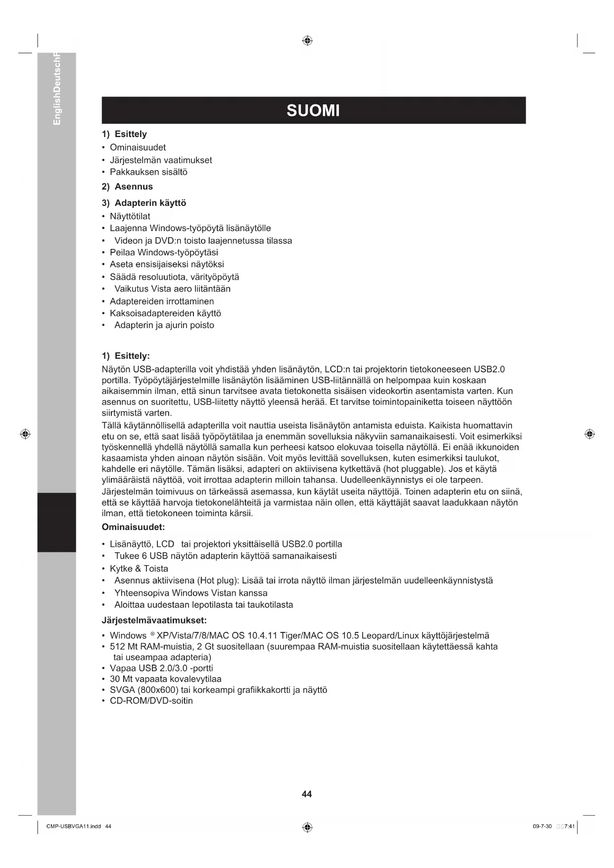 - CD-ROM/DVD-soitin EnglishDeutschFrançaisNederlandsItalianoEspañolMagyarSuomiSvenskaČeskyRomânăΕλληνικά CMP-USBVGA11.indd 44 09-7-30 7:4145 Edellä mainittujen vaatimusten lisäksi DVD-levyjen toistamiseksi adapterin kautta liitetyllä näytöllä seuraavien vaatimusten on täytyttävä: