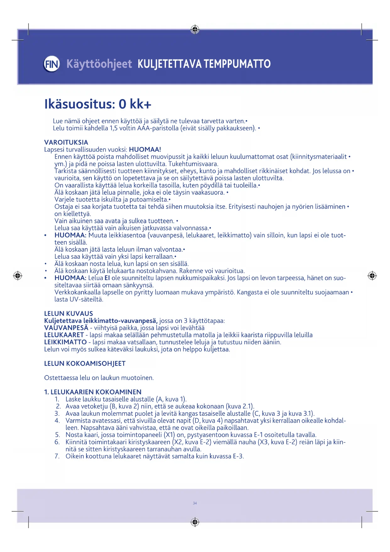 FIN Ikäsuositus: 0 kk+ Luenämäohjeetennenkäyttöäjasäilytänetulevaatarvettavarten.• Lelutoimiikahdella1,5voltinAAA-paristolla(eivätsisällypakkaukseen).• VAROITUKSIA Lapsesiturvallisuudenvuoksi:HUOMAA! Ennenkäyttöäpoistamahdollisetmuovipussitjakaikkileluunkuulumattomatosat(kiinnitysmateriaalit• ym.)japidänepoissalastenulottuvilta.Tukehtumisvaara. Tarkistasäännöllisestituotteenkiinnitykset,eheys,kuntojamahdollisetrikkinäisetkohdat.Joslelussaon• vaurioita,senkäyttöonlopetettavajaseonsäilytettäväpoissalastenulottuvilta. Onvaarallistakäyttääleluakorkeillatasoilla,kutenpöydillätaituoleilla.• Äläkoskaanjätäleluapinnalle,jokaeioletäysinvaakasuora.• Varjeletuotettaiskuiltajaputoamiselta.• Ostajaeisaakorjatatuotettataitehdäsiihenmuutoksiaitse.Erityisestinauhojenjanyörienlisääminen• onkiellettyä. Vainaikuinensaaavatajasulkeatuotteen.• Leluasaakäyttäävainaikuisenjatkuvassavalvonnassa.• HUOMAA: • Muutaleikkiasentoa(vauvanpesä,lelukaaret,leikkimatto)vainsilloin,kunlapsieioletuot- teensisällä. Äläkoskaanjätälastaleluunilmanvalvontaa.• Leluasaakäyttäävainyksilapsikerrallaan.• Äläkoskaannostalelua,kunlapsionsensisällä.• Äläkoskaankäytälelukaartanostokahvana.Rakennevoivaurioitua.• HUOMAA:• LeluaEIolesuunniteltulapsennukkumispaikaksi.Joslapsionlevontarpeessa,hänetonsuo- siteltavaasiirtääomaansänkyynsä. Verkkokankaallalapselleonpyrittyluomaanmukavaympäristö.Kangastaeiolesuunniteltusuojaamaan• lastaUV-säteiltä. LELUN KUVAUS Kuljetettava leikkimatto-vauvanpesä,jossaon3käyttötapaa: VAUVANPESÄ -viihtyisäpaikka,jossalapsivoilevähtää LELUKAARET -lapsimakaaselälläänpehmustetullamatollajaleikkiikaaristariippuvillaleluilla LEIKKIMATTO -lapsimakaavatsallaan,tunnusteleelelujajatutustuuniidenääniin. Lelunvoimyössulkeakäteväksilaukuksi,jotaonhelppokuljettaa. LELUN KOKOAMISOHJEET Ostettaessaleluonlaukunmuotoinen.