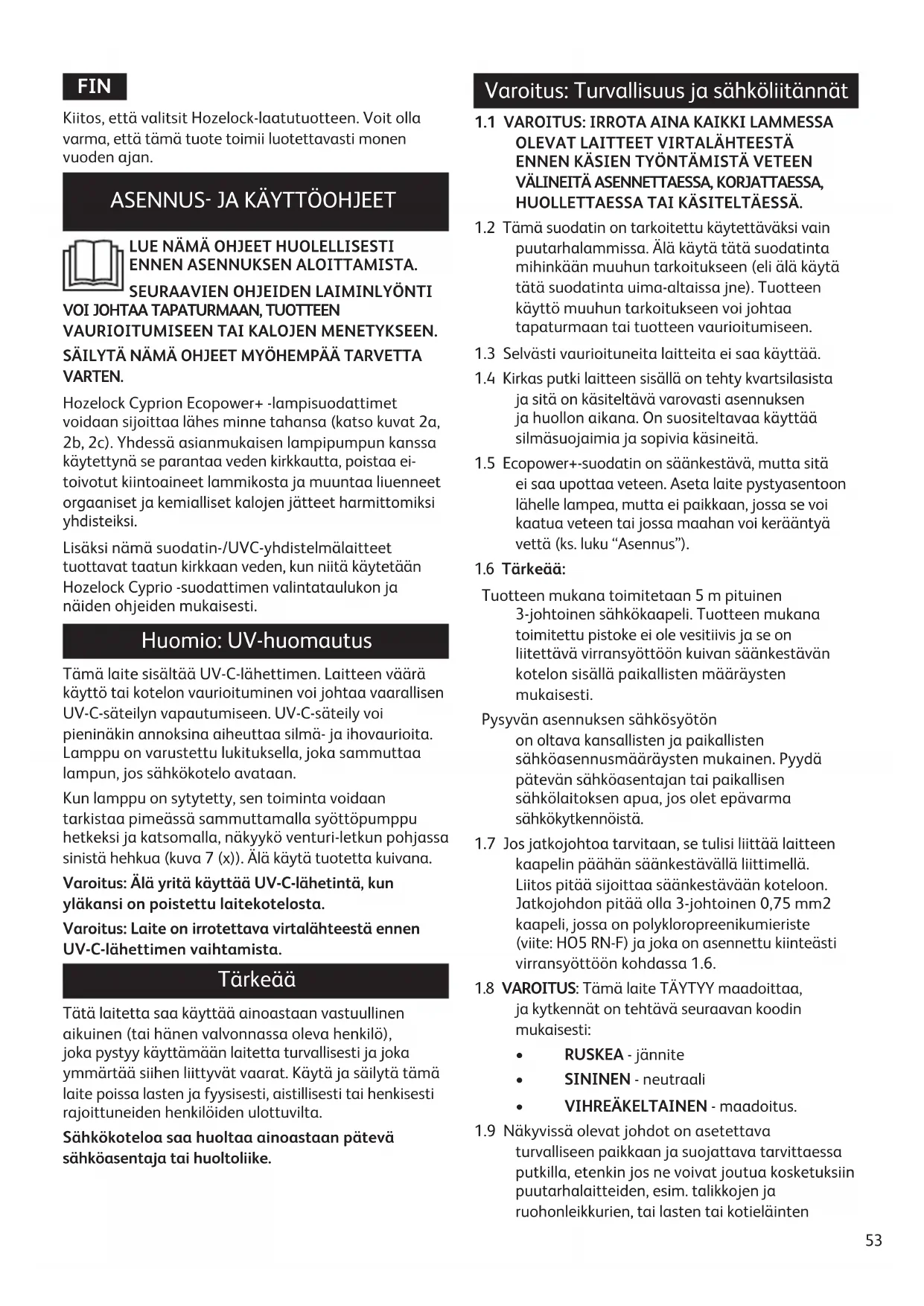 Tämä laite sisältää UV-C-lähettimen. Laitteen vääärä käyttö tai kotelon vaurioituminen voi johtaa vaarallisen UV-C-säteilyn vapautumiseen. UV-C-säteily voi pieninäkin annoksina aiheuttaa silmä- ja ihovaurioita. Lamppu on varustettu lukituksella, joka sammuttaa lampun, jos sähkökotelo avataan.