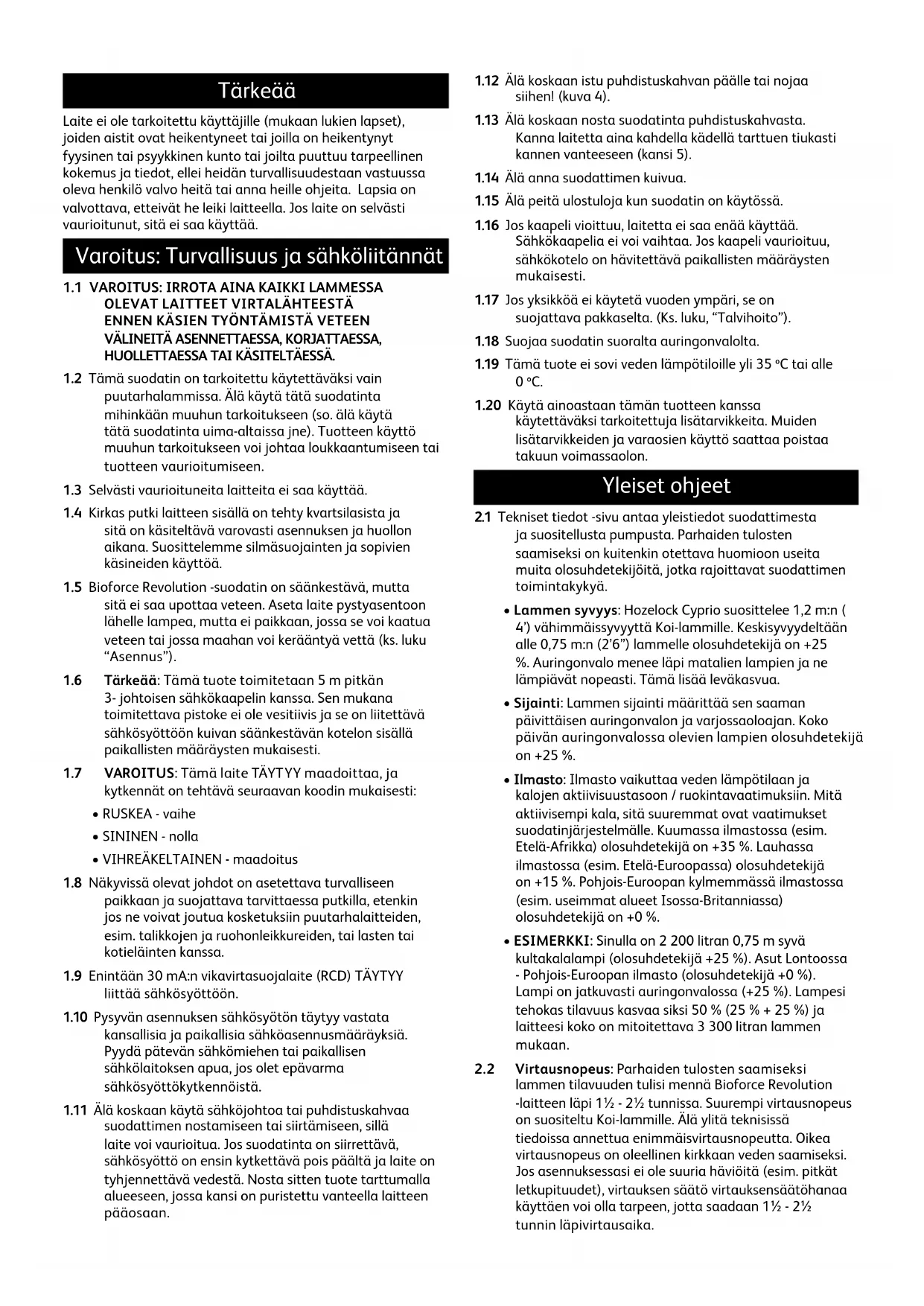 - Voidaan sijoittaa lähes minne tahansa Käytettynä yhdessä asianmukaisen lampipumpun kanssa se parantaa veden kirkkautta, poistaa ei-toivotut kiintoaineet lammikosta ja muuntaa liuenneet orgaaniset ja kemialliset kalojen jätteet harmittomiksi yhdisteiksi. Huomio: UV-huomautus Tämä laite sisältää UV-C-lähettimen. Laitteen väärä käyttö tai kotelon vaurioituminen voi johtaa vaarallisen UV-C-säteilyn vapautumiseen. UV-C-säteily voi pieninäkin annoksina aiheuttaa silmä- ja ihovaurioita. Lamppu on varustettu lukituksella, joka sammuttaa lampun, jos sähkökotelo avataan. Lamppu voidaan tarkistaa lamppu päällä katsomalla sinistä hehkua UV-merkkivalolinssistä. Älä käytä tuotetta kuivana. Varoitus: Älä yritä käyttää UV-C-lähetintä, kun se on poistettu laitekotelosta.Tärkeää Laite ei ole tarkoitettu käyttäjille (mukaan lukien lapset), joiden aistit ovat heikentyneet tai joilla on heikentynyt fyysinen tai psyykkinen kunto tai joilta puuttuu tarpeellinen kokemus ja tiedot, ellei heidän turvallisuudestaan vastuussa oleva henkilö valvo heitä tai anna heille ohjeita. Lapsia on valvottava, etteivät he leiki laitteella. Jos laite on selvästi vaurioitunut, sitä ei saa käyttää. Varoitus: Turvallisuus ja sähköliitännät