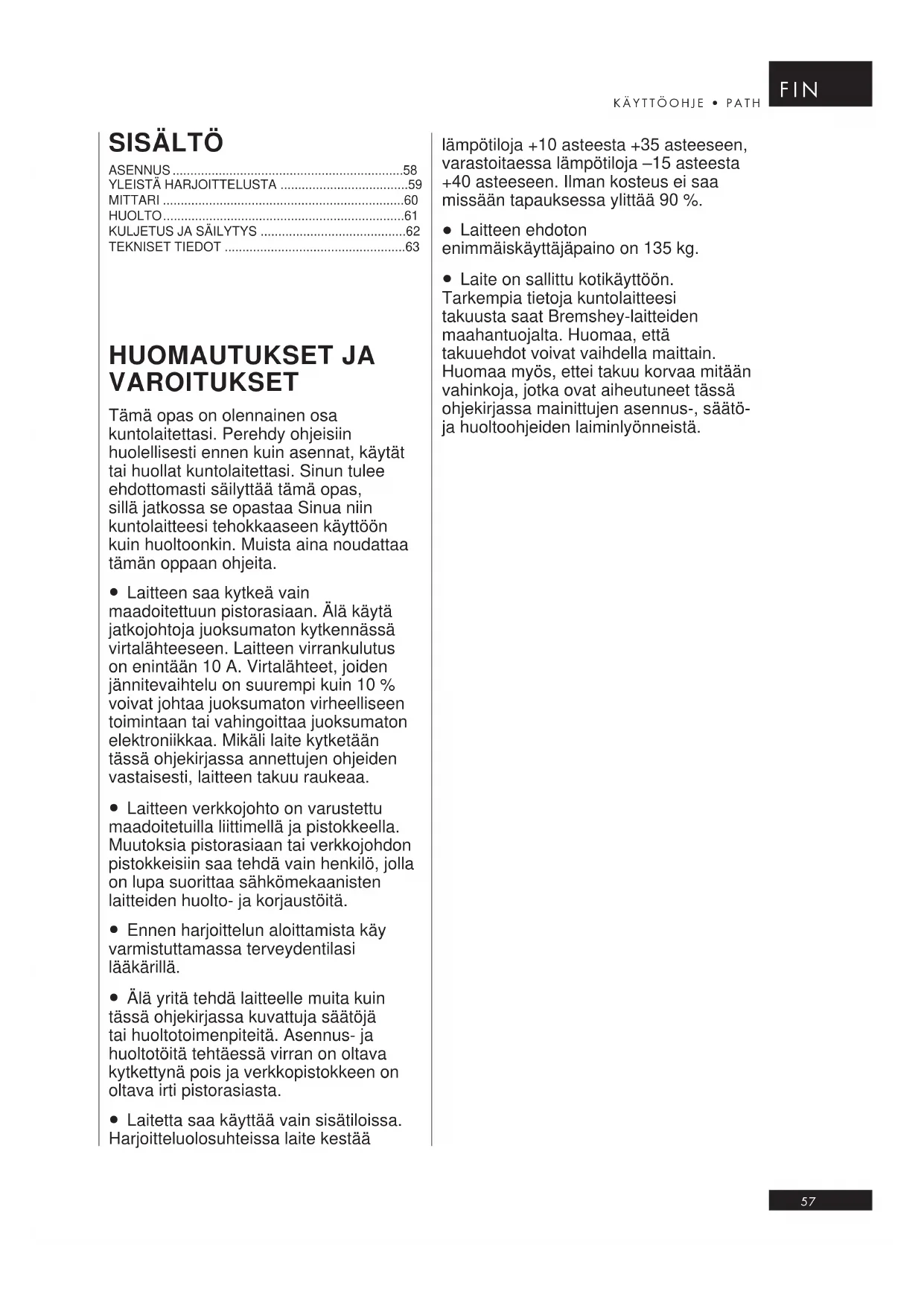 Laite on sallittu kotikayttoon. Tarkempia tietoja kuntolaitteesi takuusta saat Bremshey-laitteiden maahantuojalta. Huomaa, etta takuuehdot voivat vaihdella maittain. Huomaa myos, ettei takuu korvaa mitaan vahinkoja, jotka ovat aiheutuneet tassohjekirjassa mainittujen asennus-, saatooja huoltoohjeiden laiminlyonneista.