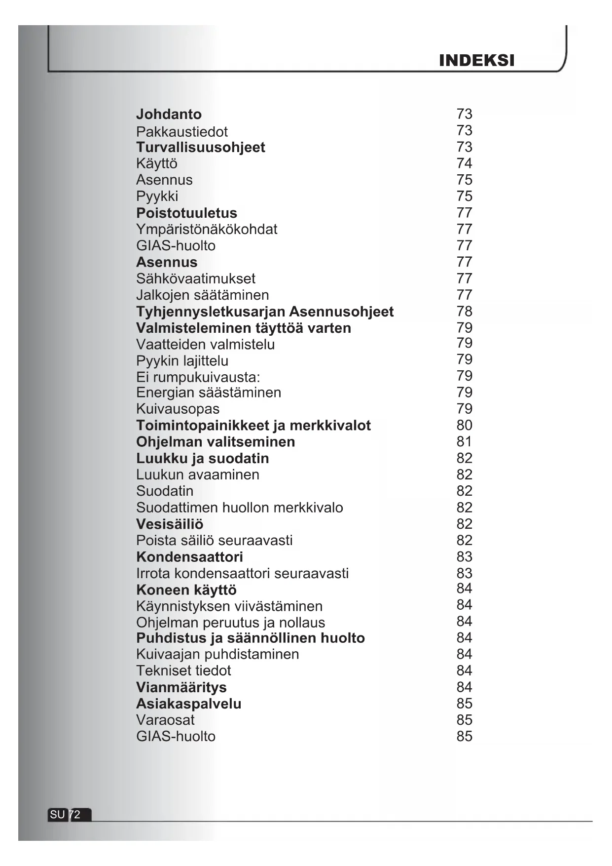 Johdanto Pakkaustiedot Turvallisuusohjeet Käyttö Asennus Pyykki Poistotuuletus Ympäristönäkökohdat GIAS-huolto Asennus Sähkövaatimukset Jalkojen säätäminen Tyhjennysletkusarjan Asennusohjeet Valmisteleminen täyttöä varten Vaatteiden valmistelu Pyykin lajittelu Ei rumpukuivausta: Energian säästäminen Kuivausopas Toimintopainikkeet ja merkkivalot Ohjelman valitseminen Luukku ja suodatin Luukun avaaminen Suodatin Suodattimen huollon merkkivalo Vesisäiliö Poista säiliö seuraavasti Kondensaattori Irrota kondensaattori seuraavasti Koneen käyttö Käynnistyksen viivästäminen Ohjelman peruutus ja nollaus Puhdistus ja säännöllinen huolto Kuivaajan puhdistaminen Tekniset tiedot Vianmääritys Asiakaspalvelu Varaosat GIAS-huoltoJOHDANTO Käyttö Tarkasta, että koneen mukana toimitetaan seuraavat osat: Ⴠ Ohjekirja Ⴠ Takuukortti Ⴠ Energialuokan kertova merkki Lue ohjeet huolellisesti ja käytä konetta niiden mukaisesti. Tässä ohjekirjassa on tärkeitä turvallista käyttöä, asennusta ja huoltoa koskevia ohjeita sekä joitakin hyödyllisiä vinkkejä, joiden avulla saavutat parhaat tulokset käyttäessäsi konetta. Säilytä koneen dokumentaatio turvallisessa paikassa tulevaa tarvetta tai tulevia omistajia varten. Pakkaustiedot TURVALLISUUSOHJEET Edellä mainitun ohjeen noudattamatta jättäminen voi heikentää laitteen turvallisuutta. Jos koneessa on väärinkäytöstä johtuva ongelma, siihen liittyvä huoltokäynti voi olla maksullinen. Tarkista, ettei kone ole vaurioitunut kuljetuksessa. Jos kone on vaurioitunut, soita valmistajan GIAShuoltoon. Ⴠ Tätä laitetta voivat käyttää vähintään 8-vuotiaat lapset sekä henkilöt, joiden fyysiset tai henkiset valmiudet eivät riitä laitteen turvallisen käsittelyyn tai joilla ei ole laitteen käytön edellyttämää kokemusta tai tietoa, jos he toimivat toisen henkilön valvonnassa tai ovat saaneet ohjeistuksen laitteen käyttöön ja käyttö tapahtuu turvallisella tavalla ja he ymmärtävät laitteen käyttöön liittyvät vaarat. Älä anna lasten leikkiä laitteella. Lapset eivät saa puhdistaa ja huoltaa laitetta ilman valvontaa. Ⴠ VAROITUS Kuivausrummun väärinkäyttö voi aiheuttaa palovaaran. Ⴠ Tämä laite on tarkoitettu käytettäväksi kotitalouksissa ja vastaavissa paikoissa, esimerkiksi: -myymälöiden, toimistojen ja muiden työpaikkojen henkilöstön keittiötiloissa; -maatiloilla; -hotellien, motellien ja muiden asuinpaikan tyyppisten paikkojen asiakkaiden käytössä; -aamiaismajoituksen kaltaisessa käytössä. Laitteen käyttö kotitalousympäristöstä poikkeavissa paikoissa tai tavanomaisista kodinhoitotoimista poikkeavalla tavalla, kuten kaupallinen asiantuntija- tai ammattilaiskäyttö, on kiellettyä myös edellä kuvatuissa paikoissa. SU 73Jos laitetta käytetään näistä ohjeista poikkeavalla tavalla, sen käyttöikä voi lyhentyä ja valmistajan takuu voi raueta. Valmistaja ei hyväksy mitään laitteelle aiheutuvia vahinkoja tai muita vahinkoja ja menetyksiä, jotka aiheutuvat kotitalouskäytöstä poikkeavasta käytöstä (myös laitteen ollessa kotitalousympäristössä), lain sallimassa enimmäislaajuudessa. Ⴠ Tämä kone on tarkoitettu vain kotikäytössä tapahtuvaan tekstiilien ja vaatteiden kuivaamiseen. ჀTätä laitetta tulee käyttää vain suunniteltuun käyttötarkoitukseen, joka on kuvattu tässä oppaassa. Perehdy asennus- ja käyttöohjeisiin hyvin ennen laitteen käyttöä. Ⴠ Älä koske laitteeseen kostein tai märin käsin tai jaloin. Ⴠ Älä nojaa luukkuun, kun täytät konetta, äläkä nosta tai liikuta konetta luukusta. Ⴠ Älä päästä lapsia leikkimään koneella tai sen toimintopainikkeilla. Ⴠ VAROITUS Älä käytä tuotetta, jos nukkasuodatin ei ole paikallaan tai jos se on vaurioitunut – nukka saattaa syttyä palamaan. ჀVAROITUS Kuumien pintojen varoitussymbolilla merkittyjen pintojen lämpötila voi kuivausrumpua käytettäessä olla yli 60 °C. Ⴠ Irrota pistoke pistorasiasta. Irrota pistoke aina ennen koneen puhdistamista. Ⴠ Älä jatka koneen käyttöä, jos havaitset sen vialliseksi. Ⴠ Älä anna pölyn tai nukan kerääntyä lattialle koneen ympärille. Ⴠ Kuivaimen sisällä oleva rumpu voi olla erittäin kuuma. Älä poista pyykkiä koneesta, ennen kuin jäähdytysaika on kokonaan loppunut. ჀKuivausohjelman viimeinen vaihe suoritetaan ilman lämmitystä (jäähdytysohjelma), jotta lämpö ei vaurioita tekstiilejä. ჀKuivausrummun suurin täyttömäärä: katso energiakilvestä 8 kg Ⴠ Kuivausrumpua ei saa käyttää, jos tekstiilien pesussa on käytetty teollisuuskemikaaleja. Ⴠ VAROITUS: Älä koskaan pysäytä kuivausrumpua ennen kuivausohjelman päättymistä, paitsi jos tekstiilit otetaan heti pois rummusta ja levitetään niin, että lämpö pääsee haihtumaan. Käyttö TURVALLISUUSOHJEET JOHDANTO SU 74TURVALLISUUSOHJEET JOHDANTO Ⴠ Tarkasta ennen käyttöä, että tuotteessa ei ole havaittavia vaurioita. Älä käytä vaurioitunutta tuotetta, vaan ota yhteyttä GIAS- huoltoon. Ⴠ Älä käytä sovittimia, useita liittimiä tai jatkojohtoja. Ⴠ Älä koskaan asenna kuivainta verhoja vasten ja varmista, että tavaroiden putoaminen tai kerääntyminen laitteen taakse on estetty.