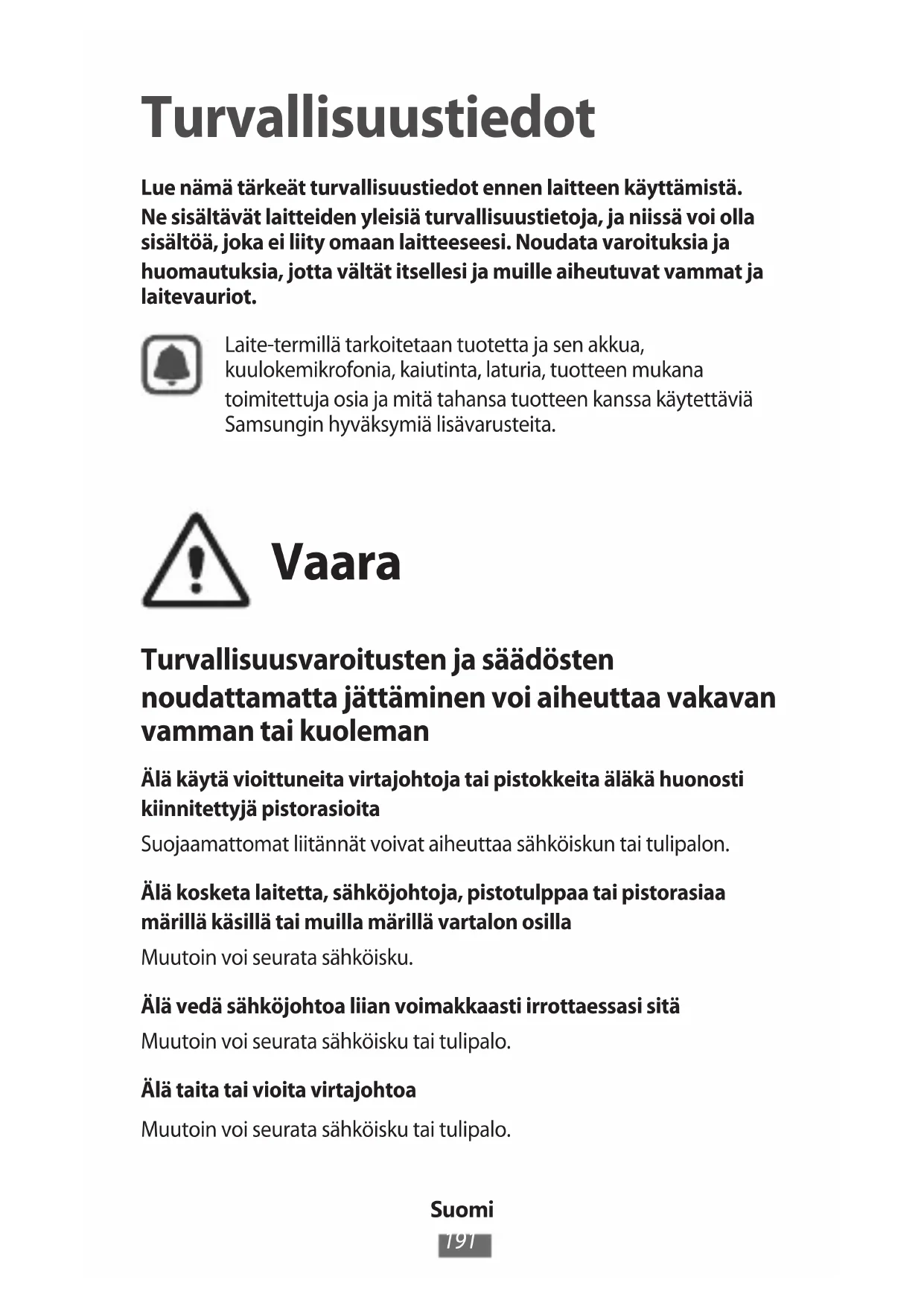 - Samsung ei ole vastuussa käyttäjän turvallisuudesta, jos käytetään lisälaitteita tai tarvikkeita, joita Samsung ei ole hyväksynyt.