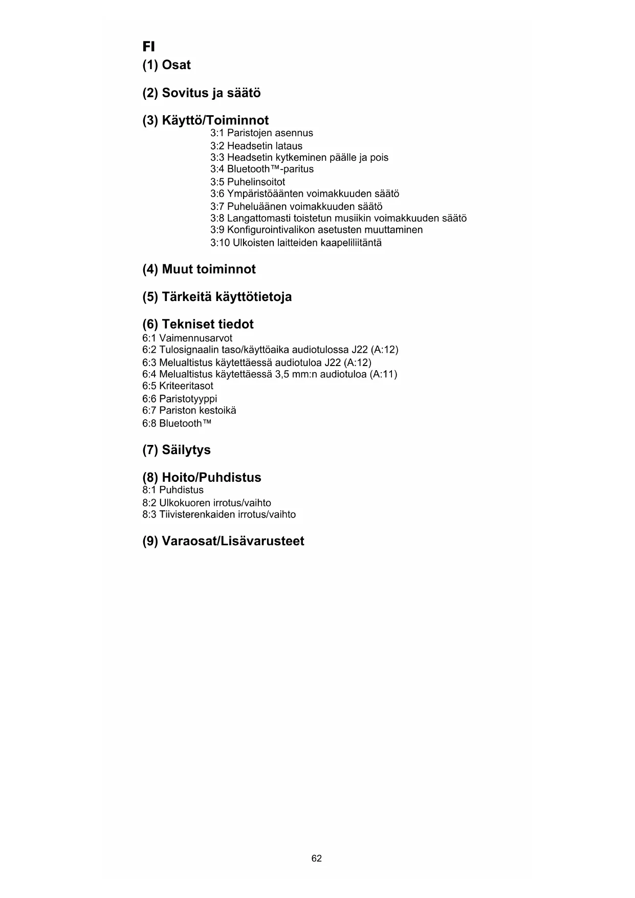 (1) Osat (2) Sovitus ja säätö (3) Käyttö/Toiminnot 3:1 Paristojen asennus 3:2 Headsetin lataus 3:3 Headsetin kytkeminen päälle ja pois 3:4 Bluetooth™-paritus 3:5 Puhelinsoitot 3:6 Ympäristöäänten voimakkuuden säätö 3:7 Puheluäänen voimakkuuden säätö 3:8 Langattomasti toistetun musiikin voimakkuuden säätö 3:9 Kongurointivalikon asetusten muuttaminen 3:10 Ulkoisten laitteiden kaapeliliitäntä (4) Muut toiminnot (5) Tärkeitä käyttötietoja (6) Tekniset tiedot 6:1 Vaimennusarvot 6:2 Tulosignaalin taso/käyttöaika audiotulossa J22 (A:12) 6:3 Melualtistus käytettäessä audiotuloa J22 (A:12) 6:4 Melualtistus käytettäessä 3,5 mm:n audiotuloa (A:11) 6:5 Kriteeritasot 6:6 Paristotyyppi 6:7 Pariston kestoikä 6:8 Bluetooth™ (7) Säilytys (8) Hoito/Puhdistus 8:1 Puhdistus 8:2 Ulkokuoren irrotus/vaihto 8:3 Tiivisterenkaiden irrotus/vaihto (9) Varaosat/Lisävarusteet62