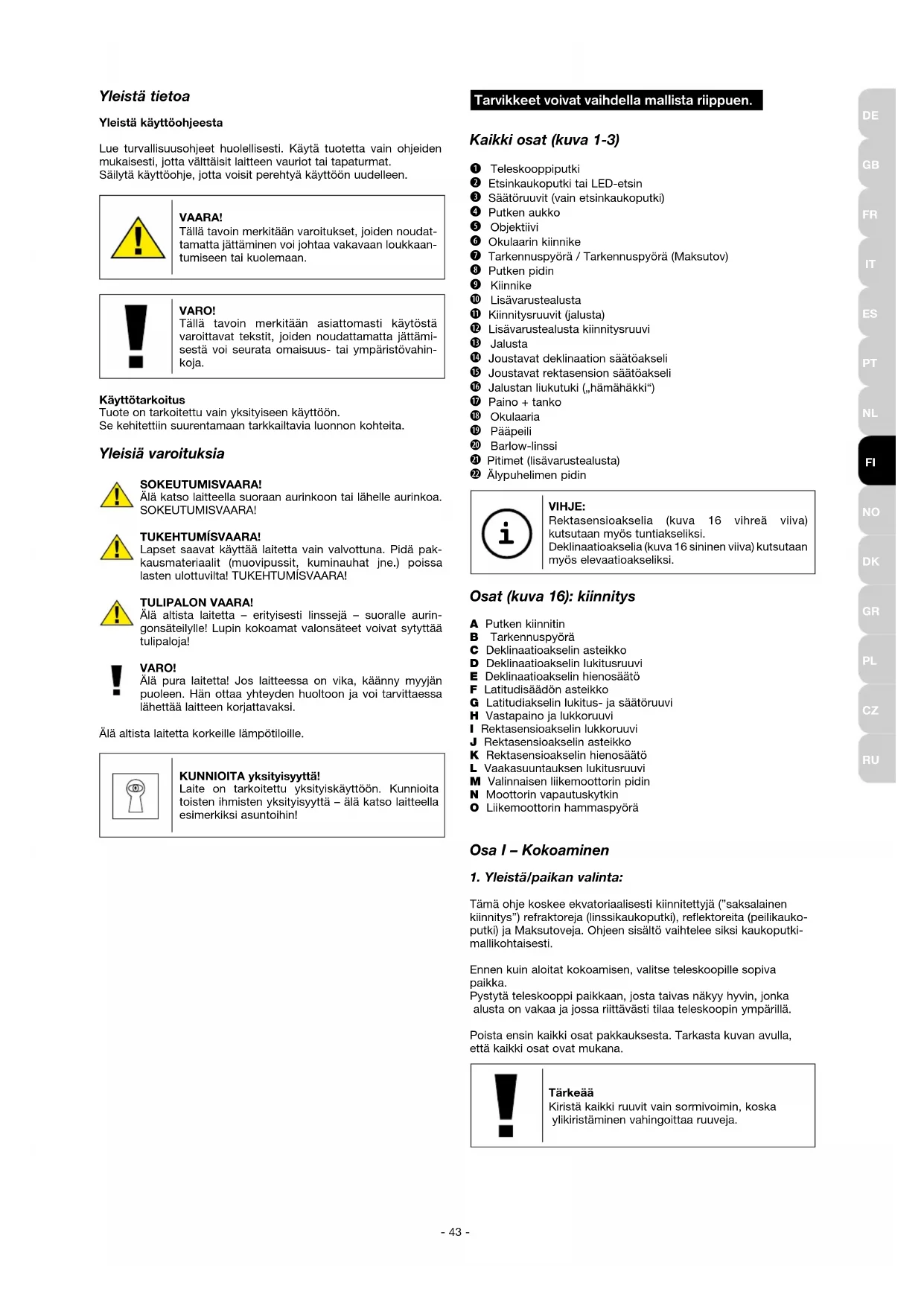 Tämä ohje koskee ekvatoriaalisesti kiinnitettyjä (”saksalainen kiinnitys”) refraktoreja (linssikaukoputki), reflektoreita (peilikauko- putki) ja Maksutoveja. Ohjeen sisältö vaihtelee siksi kaukoputki- mallikohtaisesti. Ennen kuin aloitat kokoamisen, valitse teleskoopille sopiva paikka. Pystytä teleskooppi paikkaan, josta taivas näkyy hyvin, jonka alusta on vakaa ja jossa riittävästi tilaa teleskoopin ympärillä. Poista ensin kaikki osat pakkauksesta. Tarkasta kuvan avulla, että kaikki osat ovat mukana. Tärkeää Kiristä kaikki ruuvit vain sormivoimin, koska ylikiristäminen vahingoittaa ruuveja.- 44 -
