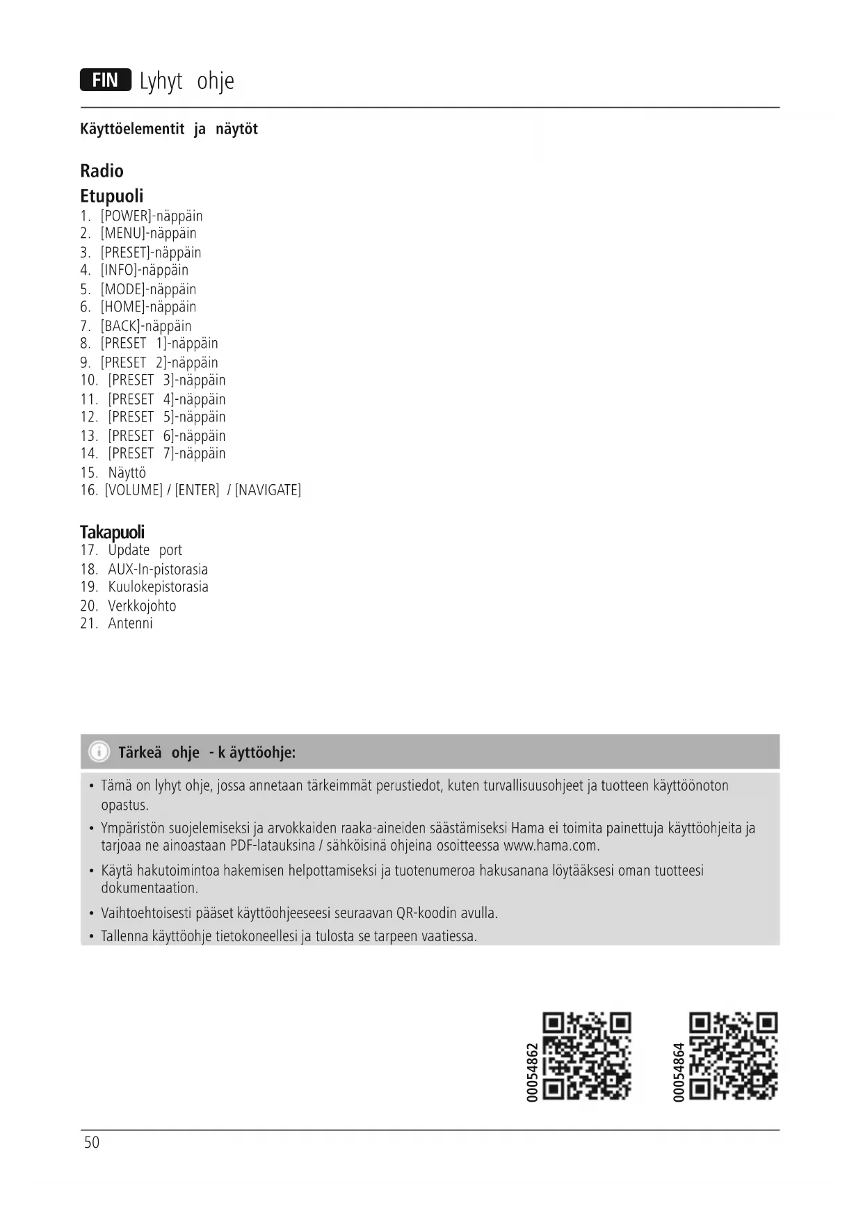 - Ympäristön suojelemiseksi ja arvokkaiden raaka-aineiden säästämiseksi Hama ei toimita painettuja käyttöohjeita ja tarjoaa ne ainoastaan PDF-latauksina /sähköisinä ohjeina osoitteessa www.hama.com.