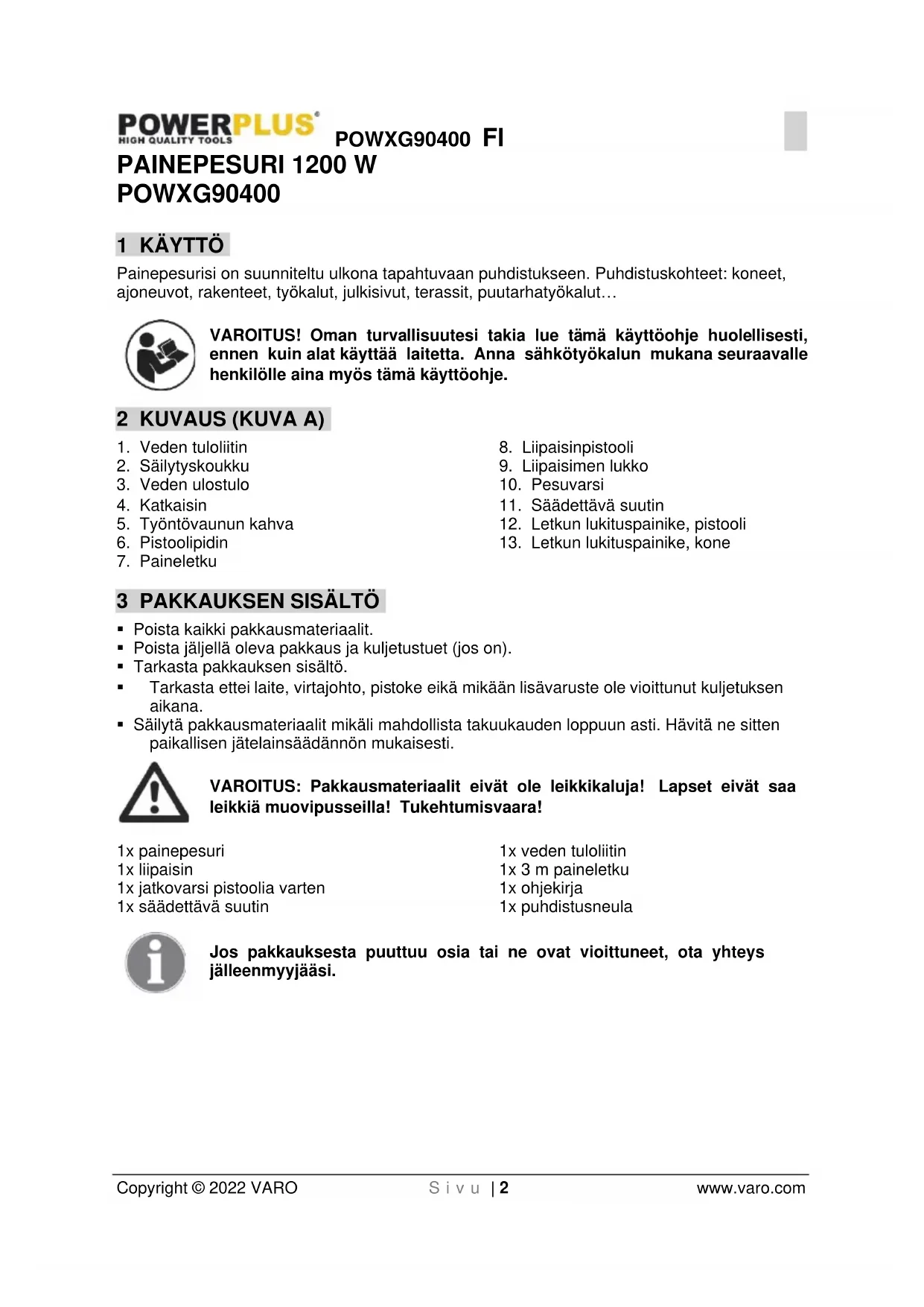 - Säilytä pakkausmateriaalit mikäli mahdollista takuukauden loppuun asti. Hävitä ne sitten paikallisen jätelainsäädännön mukaisesti. VAROITUS: Pakkausmateriaalit eivät ole leikkikaluja! Lapset eivät saa leikkiä muovipusseilla! Tukehtumisvaara! 1x painepesuri 1x liipaisin 1x jatkovarsi pistoolia varten 1x säädettävä suutin 1x veden tuloliitin 1x 3 m paineletku 1x ohjekirja 1x puhdistusneula Jos pakkauksesta puuttuu osia tai ne ovat vioittuneet, ota yhteys jälleenmyyjääsi.POWXG90400 FI Copyright © 2022 VARO S i v u | 3 www.varo.com