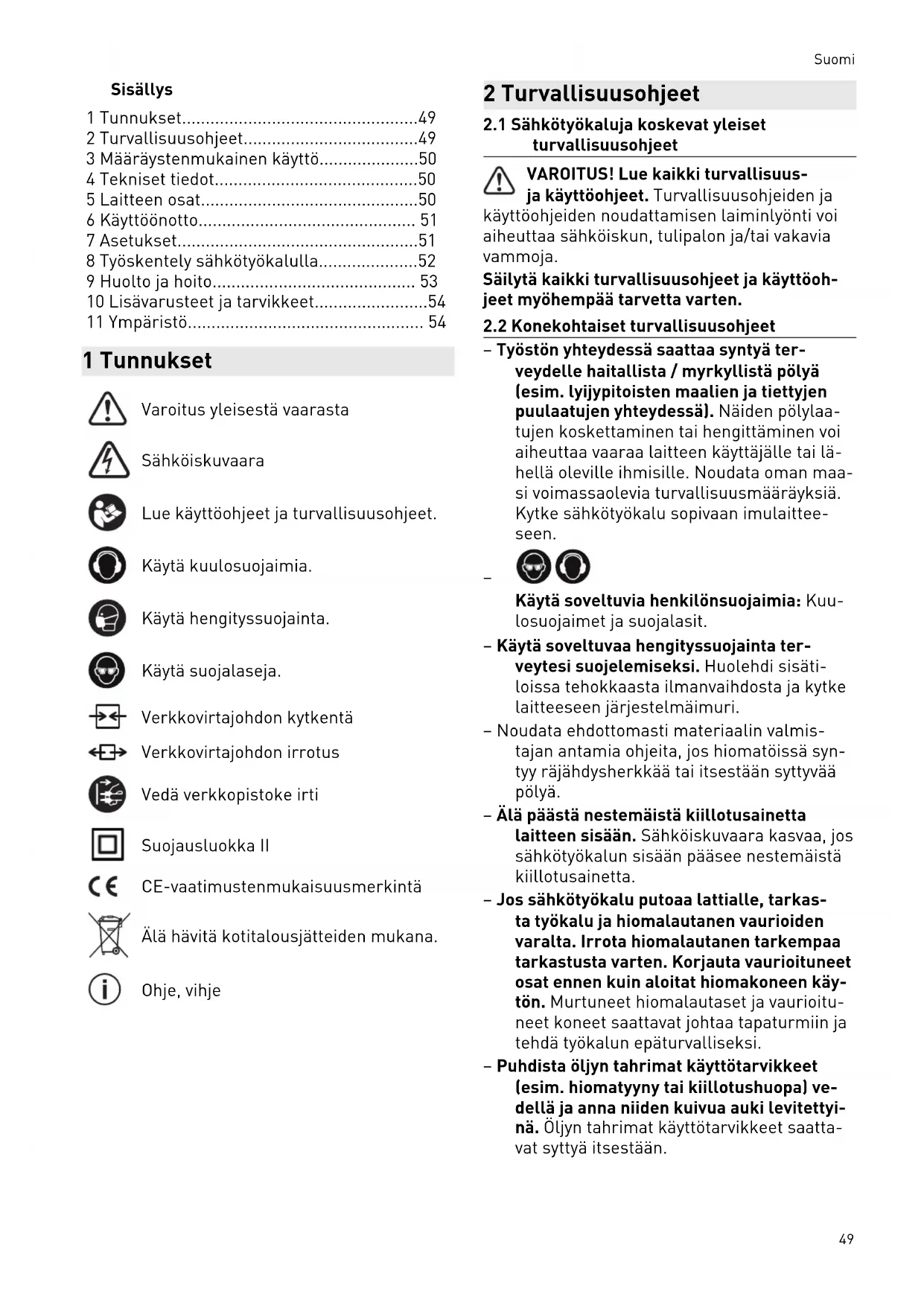- Pallokahva[5-2] (joissakin versioissa lisätar vike) mahdollistaa vaivattoman kiillotuksen ja hionnan pitkäkestoisissa töissä. ► Työnnä pallonkahva sähkötyökalun ohjain uraan[5-4] niin, että se napsahtaa paikal leen. 11 Ympäristö Älä heitä käytöstä poistettua konetta ta lousjätteiden joukkoon! Toimita käytös tä poistetut laitteet, tarvikkeet ja pak kaukset ympäristöystävälliseen kierrätykseen. Noudata voimassaolevia kansallisia määräyk siä. Käytöstä poistettuja sähkö- ja elektroniikkalait teita koskevan eurooppalaisen direktiivin ja sitä vastaavan kansallisen lainsäädännön mukaan loppuun käytetyt sähkölaitteet täytyy kerätä erikseen talteen ja toimittaa ympäristöä säästä vään kierrätykseen. Keräyspisteitä koskevat tiedot voit katsoa net tiosoitteesta www.festool.com/environment. Kriittisiä aineita koskevat tiedot: www.festool.fi/reach Suomi 54Indholdsfortegnelse 1 Symboler p. 55