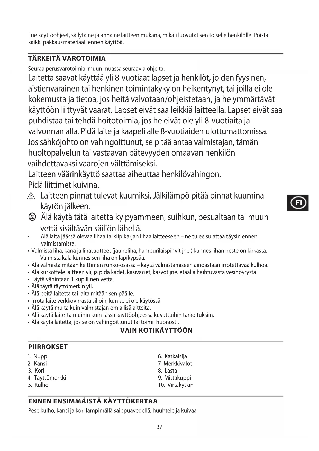 Seuraa perusvarotoimia, muun muassa seuraavia ohjeita: Laitetta saavat käyttää yli 8-vuotiaat lapset ja henkilöt, joiden fyysinen, aistienvarainen tai henkinen toimintakyky on heikentynyt, tai joilla ei ole kokemusta ja tietoa, jos heitä valvotaan/ohjeistetaan, ja he ymmärtävät käyttöön liittyvät vaarat. Lapset eivät saa leikkiä laitteella. Lapset eivät saa puhdistaa tai tehdä hoitotoimia, jos he eivät ole yli 8-vuotiaita ja valvonnan alla. Pidä laite ja kaapeli alle 8-vuotiaiden ulottumattomissa. Jos sähköjohto on vahingoittunut, se pitää antaa valmistajan, tämän huoltopalvelun tai vastaavan pätevyyden omaavan henkilön vaihdettavaksi vaarojen välttämiseksi. Laitteen väärinkäyttö saattaa aiheuttaa henkilövahingon. Pidä liittimet kuivina.