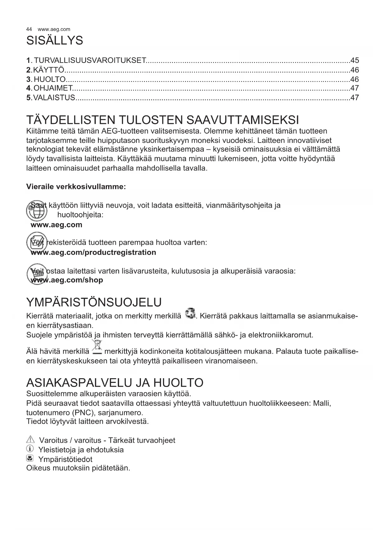 Kiitämme teitä tämän AEG-tuotteen valitsemisesta. Olemme kehittäneet tämän tuotteen tarjotaksemme teille huipputason suorituskyvyn moneksi vuodeksi. Laitteen innovatiiviset teknologiat tekevät elämästänne yksinkertaisempaa – kyseisiä ominaisuuksia ei välttämättä löydy tavallisista laitteista. Käyttäkää muutama minuutti lukemiseen, jotta voitte hyödyntää laitteen ominaisuudet parhaalla mahdollisella tavalla. Vieraile verkkosivullamme: Saat käyttöön liittyviä neuvoja, voit ladata esitteitä, vianmääritysohjeita ja huoltoohjeita: www.aeg.com Voit rekisteröidä tuotteen parempaa huoltoa varten: www.aeg.com/productregistration Voit ostaa laitettasi varten lisävarusteita, kulutusosia ja alkuperäisiä varaosia: www.aeg.com/shop