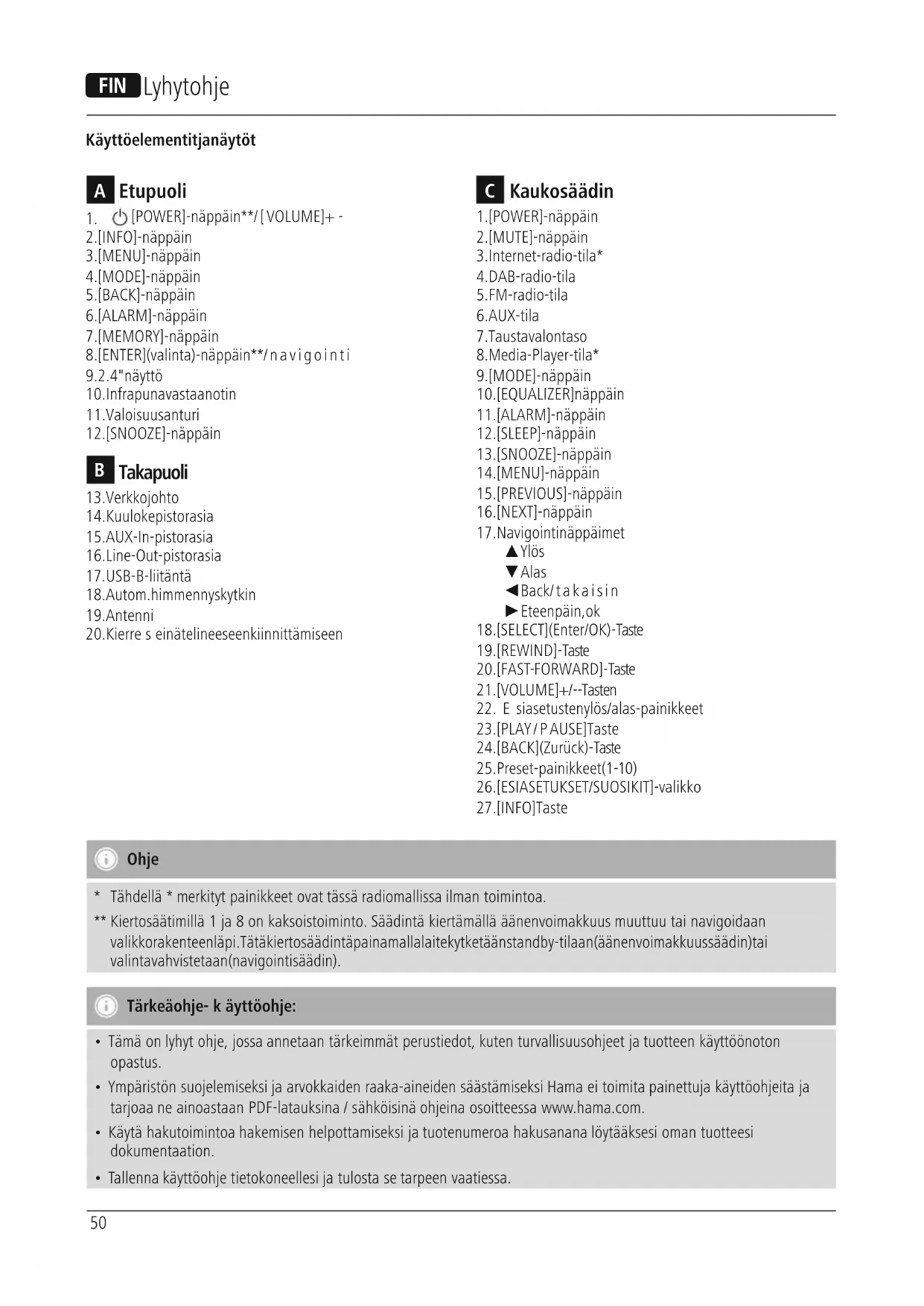 Ohje *Tähdellä *merkityt painikkeet ovat tässä radiomallissa ilman toimintoa. ** Kiertosäätimillä 1ja8on kaksoistoiminto. Säädintä kiertämällä äänenvoimakkuus muuttuu tai navigoidaan valikkorakenteen läpi. Tätä kiertosäädintä painamalla laite kytketään standby-tilaan (äänenvoimakkuussäädin) tai valinta vahvistetaan (navigointisäädin). Tärkeä ohje -käyttöohje: