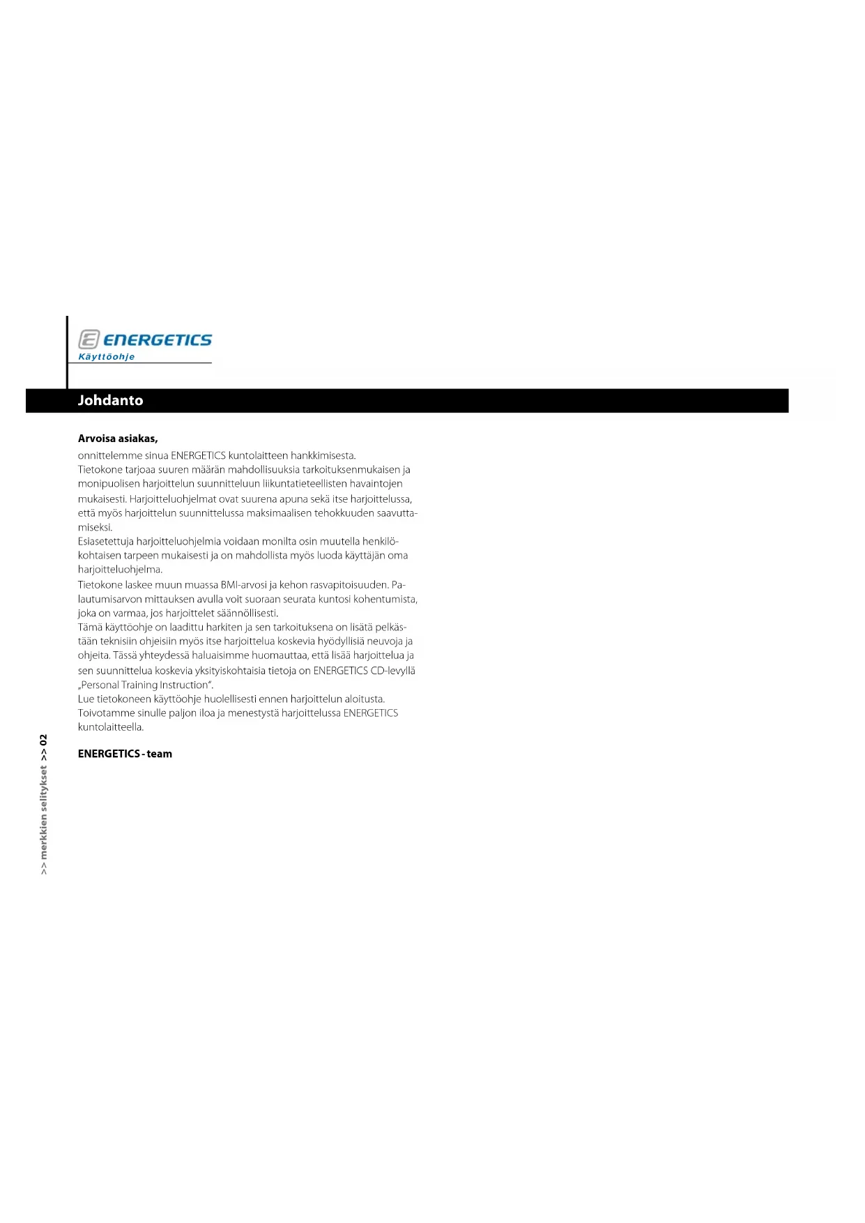 - Gørhændernelidtfugtige,hvisdeertørre. PC er brudt sammen Sjældent, hovedsageligt pga. spændingsændringer eller statisk udladning kan PC gå ud. E-203 starter normalt selv igen. Såfremt PC ikke starter af sig selv, foretag genstart. Dertil skal stikkontakten tages ud af stikket i nogle sekunder, vent og tilslut stikkontakten igen. Pleje Sørg for at ingen væske kan trænge ind i Pc’ens foderal. PC skal renses med en våd klud. Brug ikke aggressive rensemiddel. Vedligeholdelse PC kræver ikke en speciel vedligeholdelse. Se regelmæssigt efter skruer og tilslutningernes faste stilling. Defekte dele skal straks udskiftes. Kontakt forhandleren ENERGETICS.FI Sisällysluettelo Johdanto ................................................................02 Merkkien selitykset ......................................................03 Näyttö ja sen osoittimet ...........................................04 Kotelo .............................................................04 Asennus ja käynnistys ....................................................05 Tietokoneen liittäminen ...........................................05 Tietokoneen kytkeminen päälle ...................................05 Käynnistyminen, kontrolli, signaaliääni .............................05 Käynnistyminen, kontrolli, signaaliääni .............................05 Nopea käynnistys ........................................................06 Perusarvot ja -asetukset ..................................................07 Harjoitteluohjelmat – toiminnot ja asetukset .............................08 Mikä on harjoitteluohjelma ........................................08 Harjoittelun henkilökohtaiset asetukset/parametrit ................08 Harjoitteluohjelmien käyttö ........................................10 Ohjelmia koskevia yleisiä tietoja ...................................14 Näytön osoittimien ominaisuudet harjoittelun aikana ..............14 Ohjelmien valinta ja asetukset ...........................................15 Henkilökohtaiset ohjelmat .........................................15 Manuaaliasetusten ohjelma (P 1) ............................15 Käyttäjäohjelma (P 7) ........................................17 Esiasetetut ohjelmat (P 2 – 6) . . . . . . . . . . . . . . . . . . . . . . . . . . . . . . . . . . . . . . 19 Kierros (P 2) . . . . . . . . . . . . . . . . . . . . . . . . . . . . . . . . . . . . . . . . . . . . . . . . . 20 Intervalli (P 3) ...............................................20 Sola (P 4) ....................................................20 Mäki (P 5) ...................................................21 Ylikulku (P 6) ................................................21 BMI - kehon rasvapitoisuuden mittaus (P 8).........................21 Palautumisohjelma ................................................24 Harjoittelutauko/keskeytys ja resetointi ............................24 Turvallisuus .......................................................24 Usein esiintyviä kysymyksiä...............................................25 Huolto ...................................................................26 Vianetsintä ........................................................26 Puhdistus .........................................................26 Kunnossapito .....................................................26 >> sisällysluettelo >> 01 Käyttöohje E-203Käyttöohje >> merkkien selitykset >> 02 Johdanto Arvoisa asiakas, onnittelemme sinua ENERGETICS kuntolaitteen hankkimisesta. Tietokone tarjoaa suuren määrän mahdollisuuksia tarkoituksenmukaisen ja monipuolisen harjoittelun suunnitteluun liikuntatieteellisten havaintojen mukaisesti. Harjoitteluohjelmat ovat suurena apuna sekä itse harjoittelussa, että myös harjoittelun suunnittelussa maksimaalisen tehokkuuden saavutta- miseksi. Esiasetettuja harjoitteluohjelmia voidaan monilta osin muutella henkilö- kohtaisen tarpeen mukaisesti ja on mahdollista myös luoda käyttäjän oma harjoitteluohjelma. Tietokone laskee muun muassa BMI-arvosi ja kehon rasvapitoisuuden. Pa- lautumisarvon mittauksen avulla voit suoraan seurata kuntosi kohentumista, joka on varmaa, jos harjoittelet säännöllisesti. Tämä käyttöohje on laadittu harkiten ja sen tarkoituksena on lisätä pelkäs- tään teknisiin ohjeisiin myös itse harjoittelua koskevia hyödyllisiä neuvoja ja ohjeita. Tässä yhteydessä haluaisimme huomauttaa, että lisää harjoittelua ja sen suunnittelua koskevia yksityiskohtaisia tietoja on ENERGETICS CD-levyllä „Personal Training Instruction“. Lue tietokoneen käyttöohje huolellisesti ennen harjoittelun aloitusta. Toivotamme sinulle paljon iloa ja menestystä harjoittelussa ENERGETICS kuntolaitteella. ENERGETICS - teamFI >> merkkien selitykset >> 03 Merkkien selitykset Arvojen suurennuspainike Arvojen pienennyspainike Paina painiketta palautuminen Paina painiketta Start-Stop Paina painiketta Set Aseta kädet sykeantureille Ohjelma 1 (henkilökohtainen) – Manuaaliasetus Ohjelma 2 (asetettu) – Kierros Ohjelma 3 (asetettu) – Intervalli Ohjelma 4 (asetettu) – Sola Ohjelma 5 (asetettu) – Mäki Ohjelma 6 (asetettu) – Ylikulku Ohjelma 7 (henkilökohtainen) – Käyttäjä Ohjelma 8 (mittaustoiminto) – BMI - kehon rasvapitoisuusKäyttöohje >> zeichenerklärung >> 04 Näyttö ja sen osoittimet (D1) SCAN – mittaustoiminnot ovat aktiiviset (D2) FAT % – kehon rasvapitoisuus (%) (D3) PROGRAM – harjoitteluohjelma on aktiivinen tai valintamahdollisuus (D4) BMI – painoindeksi (D5) Sukupuoli – nainen (D6) Sukupuoli – mies (D7) AGE – ikä (D8) HEIGHT – pituus (cm) (D9) WEIGHT – paino (kg) (D10) P – stop, ohjelma on keskeytynyt tai mitään toimintaa ei tapahdu (D11) ohjelma 8 – BMI - kehon rasvapitoisuuden mittaus (mittaustoiminto) (D12) henkilökohtainen ohjelma 7 – Käyttäjä (D13) asetettu ohjelma 6 – Ylikulku (D14) asetettu ohjelma 5 – Mäki (D15) asetettu ohjelma 4 – Sola (D16) asetettu ohjelma 