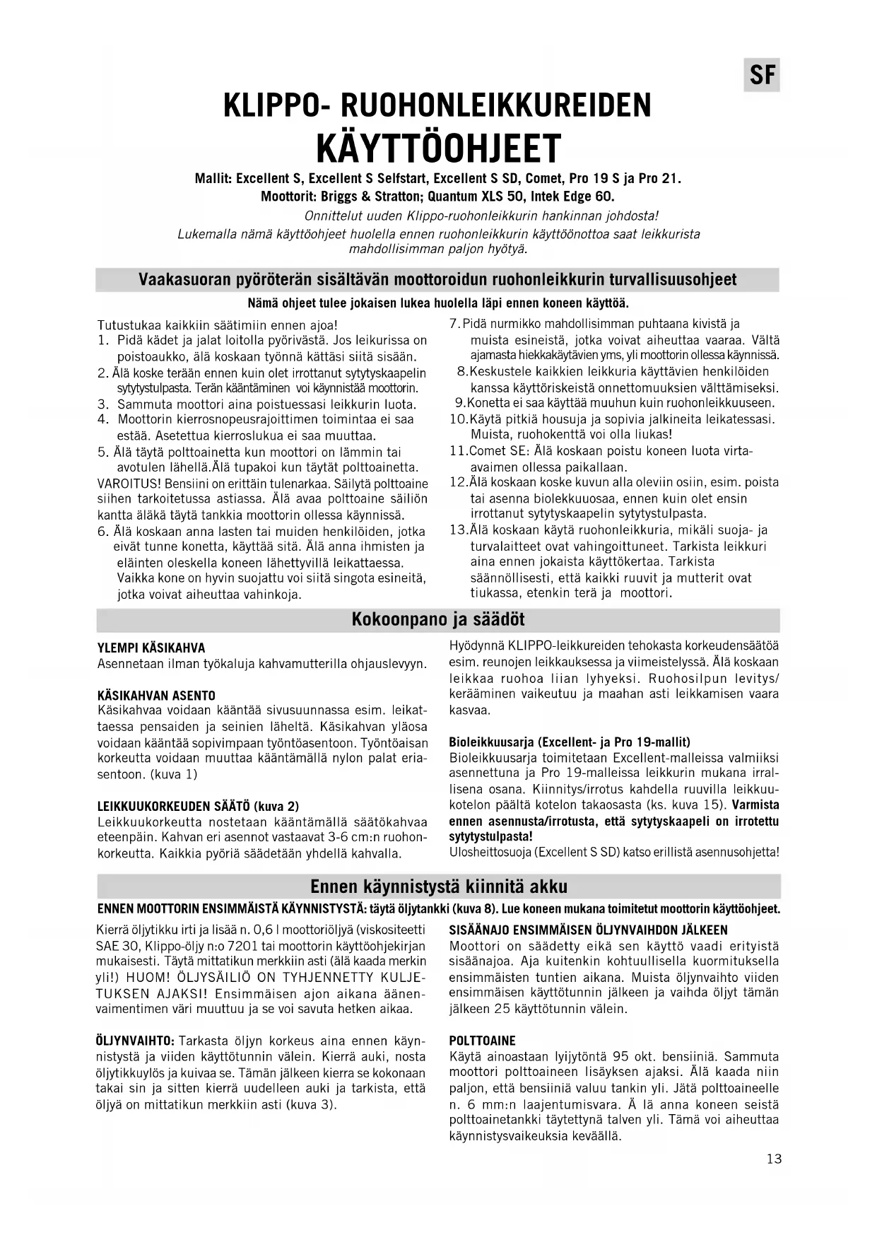 Mallit: Excellent S, Excellent S Selfstart, Excellent S SD, Comet, Pro 19 S ja Pro 21.Moottorit: Briggs & Stratton; Quantum XLS 50, Intek Edge 60. Onnittelut uuden Klippo-ruohonleikkurin hankinnan johdosta!Lukemalla nämä käyttöohjeet huolella ennen ruohonleikkurin käyttöönottoa saat leikkuristamahdollisimman paljon hyötyä.Nämä ohjeet tulee jokaisen lukea huolella läpi ennen koneen käyttöä. Ennen käynnistystä kiinnitä akku Vaakasuoran pyöröterän sisältävän moottoroidun ruohonleikkurin turvallisuusohjeet Kokoonpano ja säädöt SISÄÄNAJO ENSIMMÄISEN ÖLJYNVAIHDON JÄLKEENMoottori on säädetty eikä sen käyttö vaadi erityistäsisäänajoa. Aja kuitenkin kohtuullisella kuormituksellaensimmäisten tuntien aikana. Muista öljynvaihto viidenensimmäisen käyttötunnin jälkeen ja vaihda öljyt tämänjälkeen 25 käyttötunnin välein.POLTTOAINEKäytä ainoastaan lyijytöntä 95 okt. bensiiniä. Sammutamoottori polttoaineen lisäyksen ajaksi. Älä kaada niinpaljon, että bensiiniä valuu tankin yli. Jätä polttoaineellen. 6 mm:n laajentumisvara. Ä lä anna koneen seistäpolttoainetankki täytettynä talven yli. Tämä voi aiheuttaakäynnistysvaikeuksia keväällä. ENNEN MOOTTORIN ENSIMMÄISTÄ KÄYNNISTYSTÄ: täytä öljytankki (kuva 8). Lue koneen mukana toimitetut moottorin käyttöohjeet.