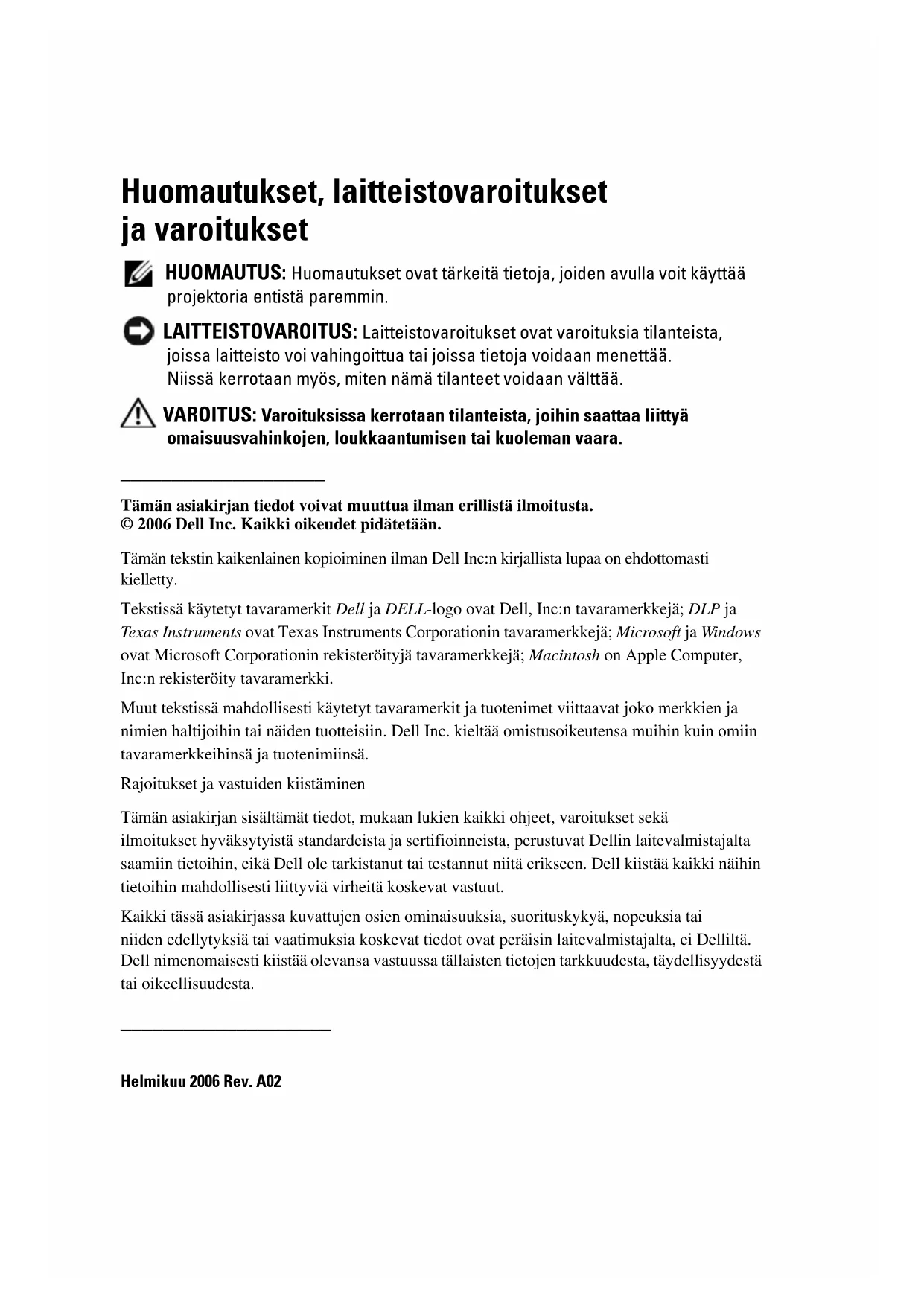 Tämän asiakirjan tiedot voivat muuttua ilman erillistä ilmoitusta. © 2006 Dell Inc. Kaikki oikeudet pidätetään. Tämän tekstin kaikenlainen kopioiminen ilman Dell Inc:n kirjallista lupaa on ehdottomasti kielletty. Tekstissä käytetyt tavaramerkit Dell ja DELL-logo ovat Dell, Inc:n tavaramerkkejä; DLP ja Texas Instruments ovat Texas Instruments Corporationin tavaramerkkejä; Microsoft ja Windows ovat Microsoft Corporationin rekisteröityjä tavaramerkkejä; Macintosh on Apple Computer, Inc:n rekisteröity tavaramerkki. Muut tekstissä mahdollisesti käytetyt tavaramerkit ja tuotenimet viittaavat joko merkkien ja nimien haltijoihin tai näiden tuotteisiin. Dell Inc. kieltää omistusoikeutensa muihin kuin omiin tavaramerkkeihinsä ja tuotenimiinsä. Rajoitukset ja vastuiden kiistäminen Tämän asiakirjan sisältämät tiedot, mukaan lukien kaikki ohjeet, varoitukset sekä ilmoitukset hyväksytyistä standardeista ja sertifioinneista, perustuvat Dellin laitevalmistajalta saamiin tietoihin, eikä Dell ole tarkistanut tai testannut niitä erikseen. Dell kiistää kaikki näihin tietoihin mahdollisesti liittyviä virheitä koskevat vastuut. Kaikki tässä asiakirjassa kuvattujen osien ominaisuuksia, suorituskykyä, nopeuksia tai niiden edellytyksiä tai vaatimuksia koskevat tiedot ovat peräisin laitevalmistajalta, ei Delliltä. Dell nimenomaisesti kiistää olevansa vastuussa tällaisten tietojen tarkkuudesta, täydellisyydestä tai oikeellisuudesta.