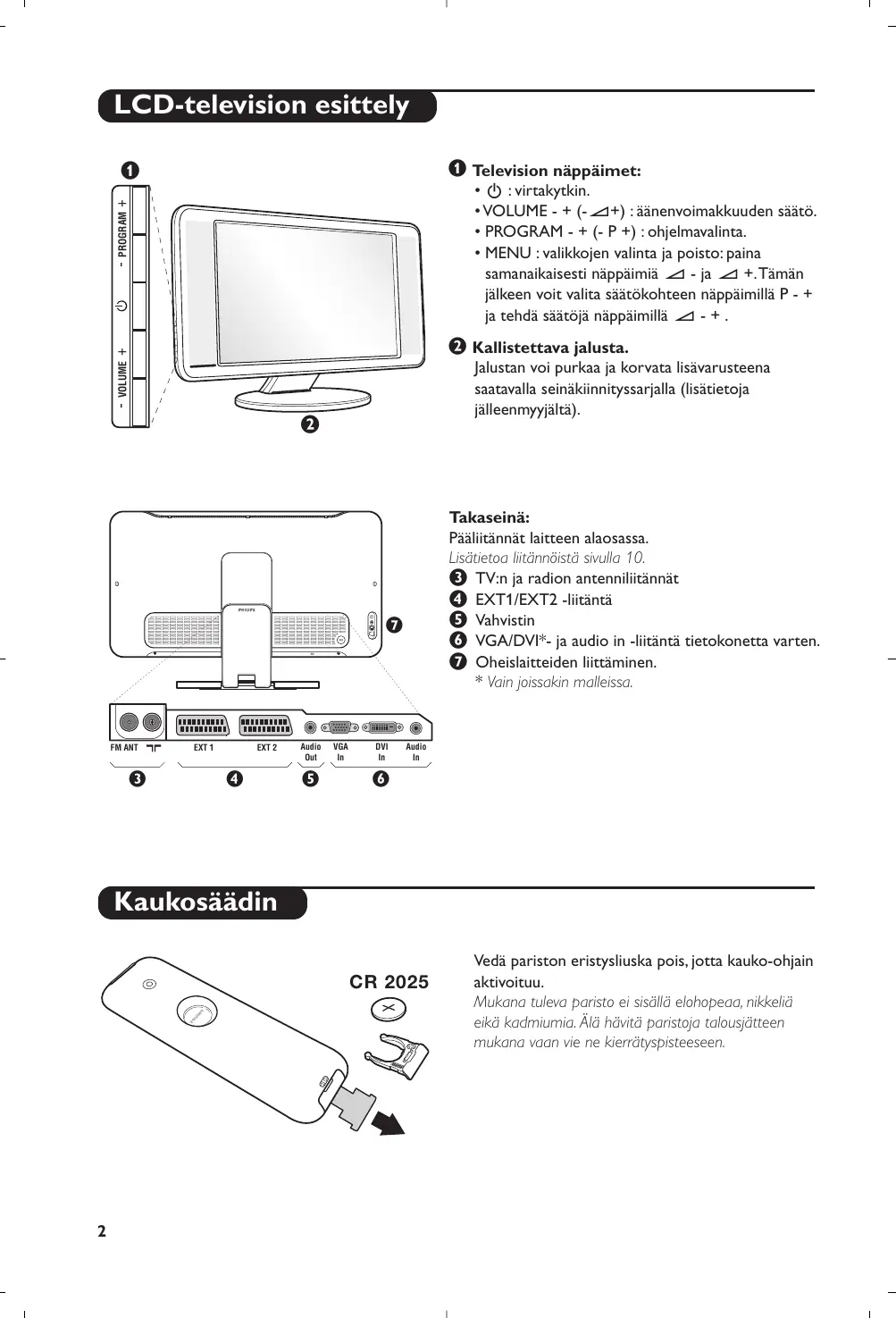 Vedä pariston eristysliuska pois, jotta kauko-ohjain aktivoituu. Mukana tuleva paristo ei sisällä elohopeaa, nikkeliä eikä kadmiumia. Älä hävitä paristoja talousjätteen mukana vaan vie ne kierrätyspisteeseen. Kaukosäätimen näppäimet Äänitoiminto Tällä näppäimellä voit asettaa stereo- ja Nicam-stereolähetykset kuulumaan monofonisina (Mono). Kaksikielisiä ohjelmia varten voit valita Dual I tai Dual II. Monomerkkivalo on punainen, kun ääni kuuluu monona. EXT-liitäntöjen valinta (sivu 10 ) Valitse televisioon liitetty laite painamalla tätä näppäintä niin monta kertaa kuin on tarpeen. Kuvakoko 16:9 (sivu 7) PIP-kuvan aktivointi (s. 8) PC / TV / Radio Näillä näppäimillä voit vaihtaa television eri toiminnot (s. 9). Active Control Optimoi kuvanlaadun vastaanoton laadun ja ympäristön valaistusolojen mukaan. Kohdistin Näiden neljän näppäimen avulla voit siirtyä valikoissa (<>≤≥). Valikko Tällä näppäimellä voit avata tai sulkea valikon. Äänen mykistys Tällä näppäimellä voit mykistää tai palauttaa äänen. Äänenvoimakkuus Näillä näppäimillä voit säätää äänenvoimakkuutta. Kuvan ja äänen esisäädöt Tällä näppäimellä saat näkyviin kuvan ja äänen esisäädöt. Oma Säätö -asetus vastaa valikoissa tekemiäsi valintoja Kuvaruutunäyttö Näyttää ruudulla/poistaa ruudulta ohjelmanumero, kellonajan, äänitilan ja ajastimessa jäljellä olevan ajan. Pidä painettuna viisi sekuntia niin ohjelmanumero jää pysyvästi ruudulle. Odotustila Kytkee TV:n odotustilaan. Paina näppäimiä ., P - + tai ñ/ô, ja TV menee uudestaan päälle. Tilanvalitsin * Pixel + (riippuvainen mallista) Pixel + toiminnon esittelyn kytkentä / katkaisu. Surround-ääni Kytkee surround-äänitehosteen päälle tai pois päältä. Stereoäänen yhteydessä tämä toiminto antaa vaikutelman, että kaiuttimet ovat todellista kauempana toisistaan. Jos televisiossasi on Virtual Dolby Surround* toiminto, saat ohjelmiin Dolby Surround Pro Logic äänentoiston. Teksti-tv:n valinta (sivu 8) Ohjemaluettelo Voit tuoda näyttöön / poistaa näytöstä kanavaluettelon.Valitse kanava näppäimillä <>.Tuo luettelo näyttöön näppäimellä ≥.