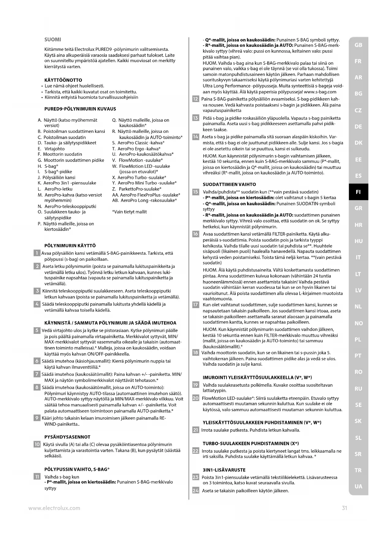 UASUOMI Kiitämme teitä Electrolux PURED9 -pölynimurin valitsemisesta. Käytä aina alkuperäisiä varaosia saadaksesi parhaat tulokset. Laite on suunniteltu ympäristöä ajatellen. Kaikki muoviosat on merkitty kierrätystä varten.