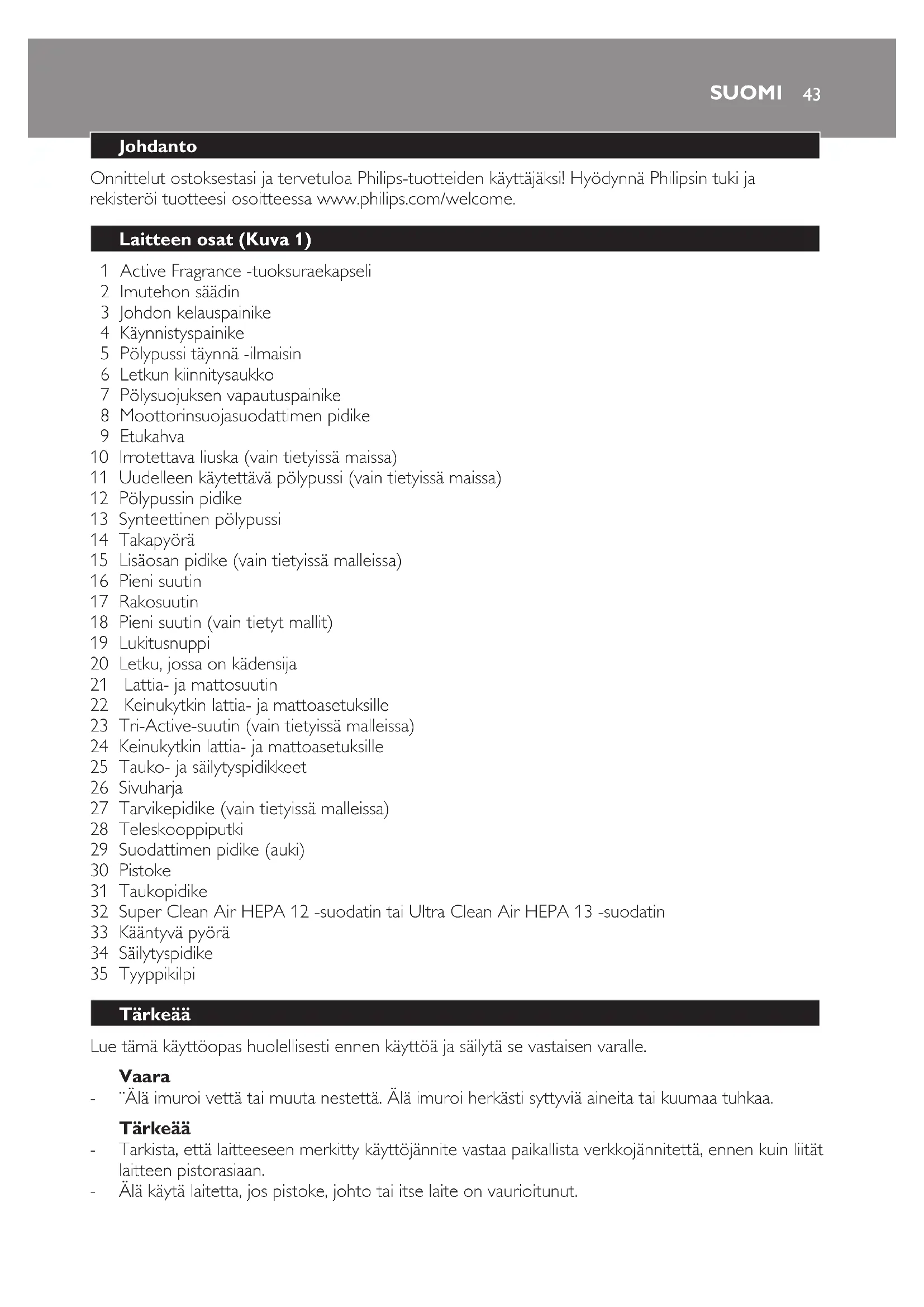ESPAÑOL4243 Johdanto Onnittelut ostoksestasi ja tervetuloa Philips-tuotteiden käyttäjäksi! Hyödynnä Philipsin tuki ja rekisteröi tuotteesi osoitteessa www.philips.com/welcome. Laitteen osat (Kuva 1) 1 Active Fragrance -tuoksuraekapseli 2 Imutehon säädin 3 Johdon kelauspainike 4 Käynnistyspainike 5 Pölypussi täynnä -ilmaisin 6 Letkun kiinnitysaukko 7 Pölysuojuksen vapautuspainike 8 Moottorinsuojasuodattimen pidike 9 Etukahva 10 Irrotettava liuska (vain tietyissä maissa) 11 Uudelleen käytettävä pölypussi (vain tietyissä maissa) 12 Pölypussin pidike 13 Synteettinen pölypussi 14 Takapyörä 15 Lisäosan pidike (vain tietyissä malleissa) 16 Pieni suutin 17 Rakosuutin 18 Pieni suutin (vain tietyt mallit) 19 Lukitusnuppi 20 Letku, jossa on kädensija 21 Lattia- ja mattosuutin 22 Keinukytkin lattia- ja mattoasetuksille 23 Tri-Active-suutin (vain tietyissä malleissa) 24 Keinukytkin lattia- ja mattoasetuksille 25 Tauko- ja säilytyspidikkeet 26 Sivuharja 27 Tarvikepidike (vain tietyissä malleissa) 28 Teleskooppiputki 29 Suodattimen pidike (auki) 30 Pistoke 31 Taukopidike 32 Super Clean Air HEPA 12 -suodatin tai Ultra Clean Air HEPA 13 -suodatin 33 Kääntyvä pyörä 34 Säilytyspidike 35 Tyyppikilpi Tärkeää Lue tämä käyttöopas huolellisesti ennen käyttöä ja säilytä se vastaisen varalle. Vaara ¨Älä imuroi vettä tai muuta nestettä. Älä imuroi herkästi syttyviä aineita tai kuumaa tuhkaa. Tärkeää Tarkista, että laitteeseen merkitty käyttöjännite vastaa paikallista verkkojännitettä, ennen kuin liität laitteen pistorasiaan. Älä käytä laitetta, jos pistoke, johto tai itse laite on vaurioitunut.