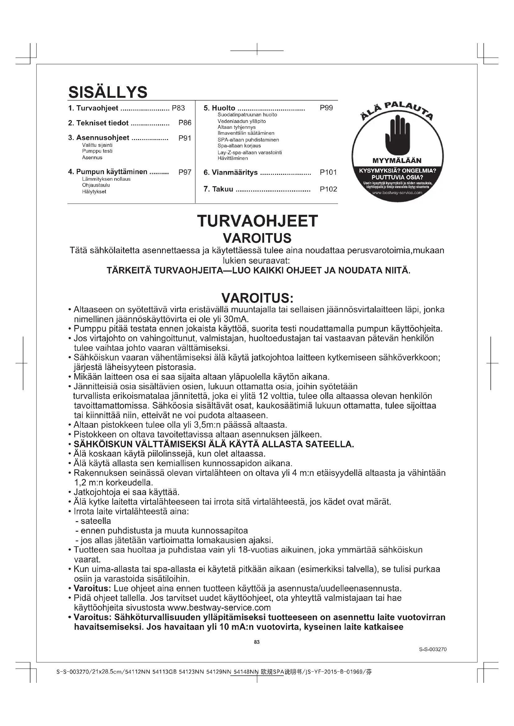 SISÄLLYS KYSYMYKSIÄ? ONGELMIA?PUUTTUVIA OSIA?Usein kysyttyjä kysymyksiä ja niiden vastauksia,käyttöoppaita ja tietoja varaosista löytyy sivustostawww.bestway-service.com MYYMÄLÄÄNS-S-003270/21x28.5cm/54112NN 54113GB 54123NN 54129NN 54148NN 欧规SPA说明书/JS-YF-2015-B-01969/芬 VAROITUS: