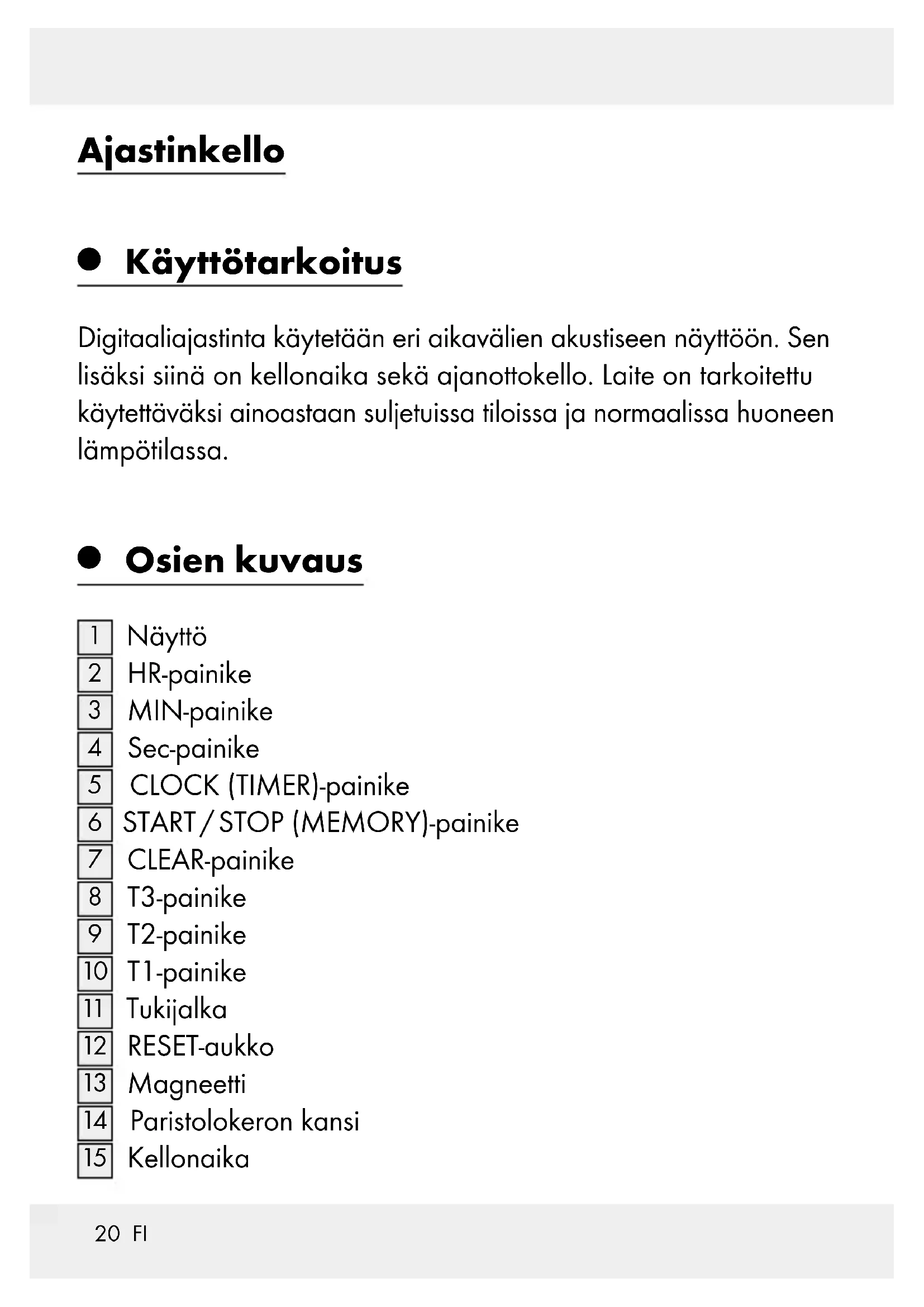 Käyttötarkoitus Digitaaliajastinta käytetään eri aikavälien akustiseen näyttöön. Sen lisäksi siinä on kellonaika sekä ajanottokello. Laite on tarkoitettu käytettäväksi ainoastaan suljetuissa tiloissa ja normaalissa huoneen lämpötilassa.