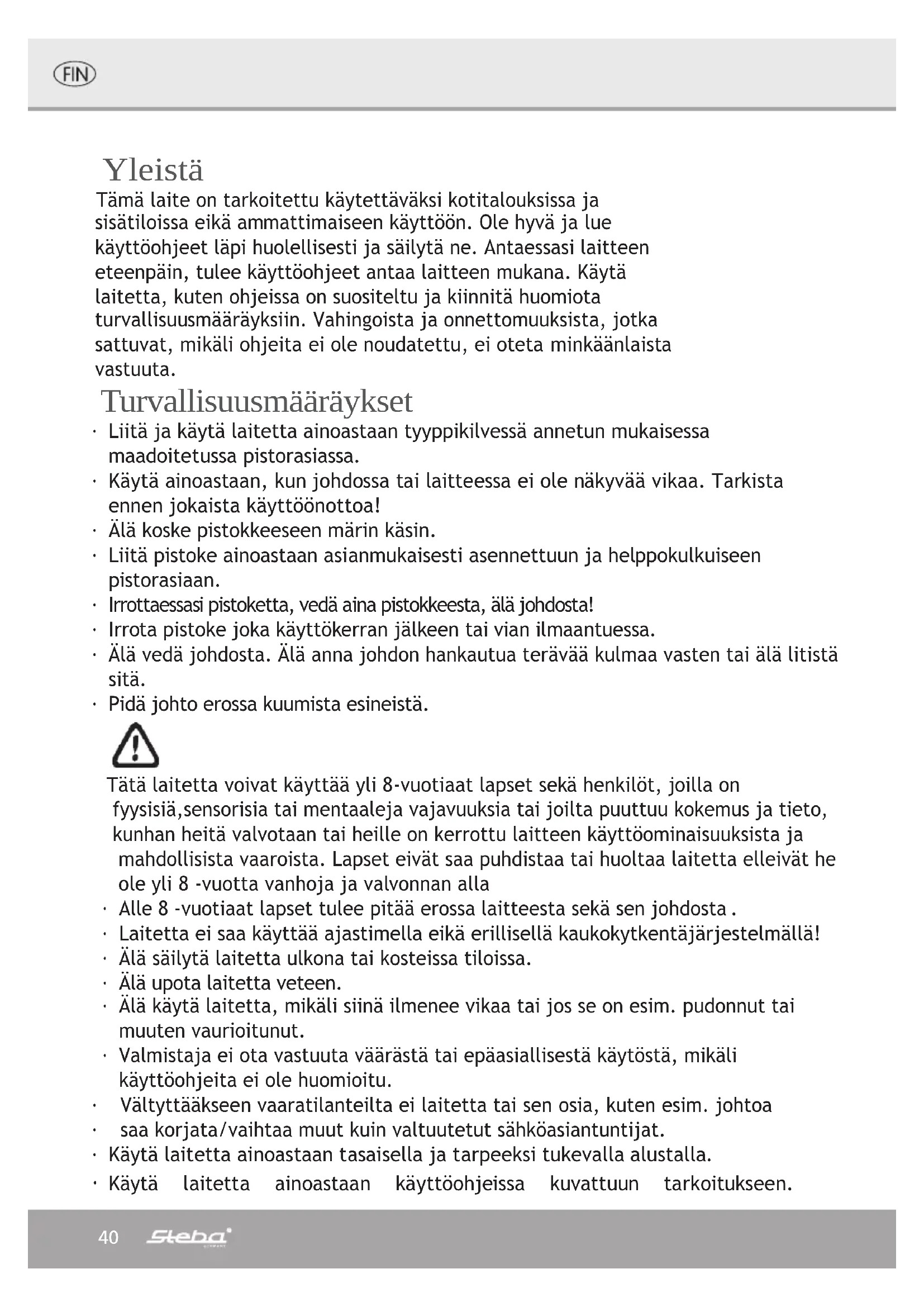 Tätä laitetta voivat käyttää yli 8-vuotiaat lapset sekä henkilöt, joilla on fyysisiä,sensorisia tai mentaaleja vajavuuksia tai joilta puuttuu kokemus ja tieto, kunhan heitä valvotaan tai heille on kerrottu laitteen käyttöominaisuuksista ja mahdollisista vaaroista. Lapset eivät saa puhdistaa tai huoltaa laitetta elleivät he ole yli 8 -vuotta vanhoja ja valvonnan alla