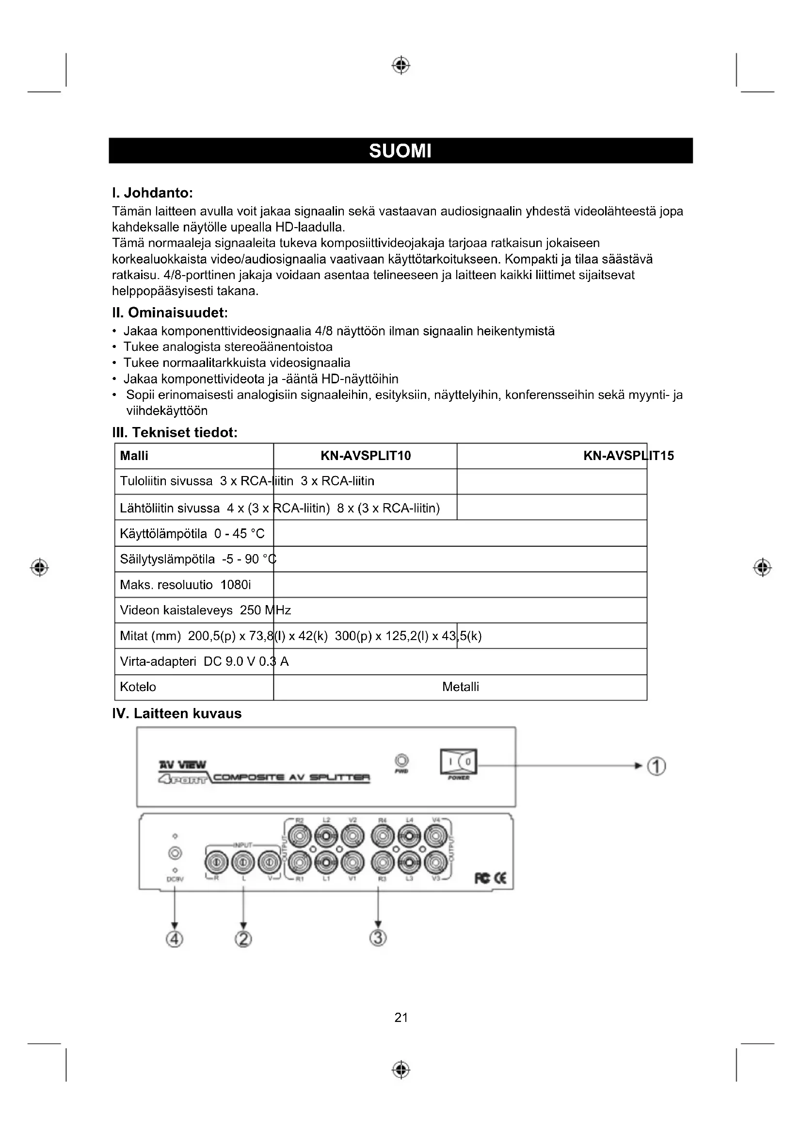 Malli KN-AVSPLIT10 KN-AVSPLIT15 Tuloliitin sivussa 3 x RCA-liitin 3 x RCA-liitin Lähtöliitin sivussa 4 x (3 x RCA-liitin) 8 x (3 x RCA-liitin) Käyttölämpötila 0 - 45 °C Säilytyslämpötila -5 - 90 °C Maks. resoluutio 1080i Videon kaistaleveys 250 MHz Mitat (mm) 200,5(p) x 73,8(l) x 42(k) 300(p) x 125,2(l) x 43,5(k) Virta-adapteri DC 9.0 V 0.3 A Kotelo Metalli