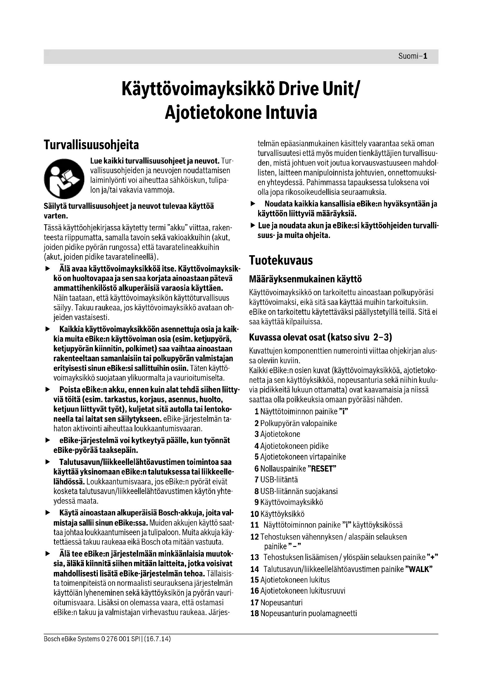 ohjelmiston versiovirhe Ota yhteys Boschin eBike-jälleenmyyjään, joka tekee ohjelmiston päivi- tyksen. Ei näyttöä ajotietokoneen sisäinen vika Käynnistä eBike-järjestelmä uudelleen kytkemällä se ensin ja pois ja sitten taas päälle. Koodi Syy KorjausSuomi–7 Bosch eBike Systems 0 276 001 SPI | (16.7.14) Ulkoisten laitteiden energiahuolto USB-liitän- nän kautta USB-liitännän avulla voidaan käyttää tai ladata useimmat lait- teet, joiden energiahuolto USB:n kautta on mahdollinen (esim. eräät matkapuhelimet). Lataaminen edellyttää, että eBike-pyörään on asennettu ajo- tietokone ja riittävän täyteen ladattu akku. Avaa ajotietokoneen USB-liitännän suojakansi 8. Yhdistä ul- koisen laitteen USB-liitäntä normien mukaisella Micro A/Micro B USB-2.0-johdolla ajotietokoneen USB-kos- kettimeen 7. Normien vastaisen USB-johdon tai johto-/adap- teriyhdistelmän käyttö voi aiheuttaa ajotietokoneen vaurioitu- misen. Ajovihjeitä eBike-järjestelmän käyttöön Milloin eBike-käyttölaite toimii? eBike-käyttölaite tehostaa ajoa aina, kun poljet. Polkematta tehostus ei toimi. Moottorin teho riippuu aina siitä voimasta, jolla poljet. Kun käytät vähän voimaa, tehostus on pienempi kuin paljon voi- maa käyttäessäsi. Tämä pätee riippumatta tehostustasosta. eBike-käyttölaite kytkeytyy automaattisesti pois yli 25/45 km/h nopeudessa. Kun nopeus putoaa alle 25/45 km/h, käyttölaite on automaattisesti taas käytettävissä. Poikkeuksen muodostaa työntöaputoiminto, jossa eBike:a työntää alhaisella nopeudella polkimia polkematta. Polkimet saattavat pyöriä työntöapua käytettäessä. Voit myös milloin vain ajaa eBike:a ilman tehostusta kuten tavallista polkupyörää, joko kytkemällä eBike-järjestelmä pois päältä tai asettamalla tehostustaso asentoon ”OFF”. Sama koskee tilannetta, jolloin akku on tyhjä. eBike-järjestelmän yhteispeli vaihteiden kanssa Käytä vaihteita kuten tavallisessa polkupyörässä myös eBike- käyttölaiteen kanssa (noudata eBike:n käyttöohjetta). Kaikessa vaihtamisessa on suositeltavaa hetkeksi keskeyttää polkeminen vaihtamisen ajaksi. Tällöin vaihtaminen on hel- pompaa ja voimansiirron kuluminen on pienempi. Valitsemalla vaihde oikein voit nostaa nopeutta ja pidentää toimintamatkaa käyttövoimaa lisäämättä. Noudata siksi vaihtosuosituksia, jotka ilmoitetaan näytön il- moituksilla g ja h. Kun ilmoitus g tulee näyttöön, silloin kan- nattaa vaihtaa suuremmalle vaihteelle, minkä myötä poljenta- taajuus alenee. Kun ilmoitus h tulee näyttöön, silloin kannattaa vaihtaa pienemmälle vaihteelle, minkä myötä pol- jentataajuus nousee. Ensimmäisten kokemusten hankkiminen On suositeltavaa hankkia ensimmäiset kokemukset eBike:n kanssa muualla kuin vilkkaasti liikennöidyillä kaduilla. Kokeile erilaisia tehostustasoja. Kun olet saavuttanut varmuu- den, voit käyttää eBike:a liikenteessä, kuten mitä tahansa pol- kupyörää. Kokeile eBike:si toimintamatkaa erilaisissa olosuhteissa, en- nen kuin suunnittelet pitkiä, vaativia matkoja. Toimintamatkaan vaikuttavat tekijät Toimintamatkaan vaikuttavat kuitenkin monet tekijät, kuten esimerkiksi: – tehostustaso, – vaihteiden valinta, – rengasmalli ja renkaiden ilmanpaine, – akun ikä ja hoitotila, – matkan profiili (nousut) ja tien ominaisuus (päällystys), – vastatuuli ja ympäristön lämpötila, – eBike:n, pyöräilijän ja matkatavaran paino. Tästä syystä toimintamatkaa ei voi arvioida tarkalleen etukä- teen. Seuraavat periaatteet ovat kuitenkin voimassa: – eBike:n käyttölaitteen samalla moottoriteholla: mitä vä- hemmän voimaa käytät määrätyn nopeuden saavuttami- seksi (esim. vaihtamalla optimaalisesti), sitä vähemmän energiaa eBike:n käyttölaite kuluttaa, ja sitä pidemmälle pääset yhdellä akun latauksella. –Mitä suuremman tehostustaseen valitset muuten saman- laisissa olosuhteissa, sitä lyhyemmäksi muodostuu toimin- tamatka. eBike:n hoito ja käsittely Noudata eBike-komponenttien käyttö- ja säilytyslämpötiloja. Suojaa käyttövoimayksikkö, ajotietokone ja akku äärimmäisil- tä lämpötiloilta (vältä esim. voimakasta auringonpaistetta il- man samanaikaista tuuletusta). Komponentit (erityisesti ak- ku) voivat vahingoittua äärimmäisten lämpötilojen takia.Suomi–8 0 276 001 SPI | (16.7.14) Bosch eBike Systems Hoito ja huolto Huolto ja puhdistus Pidä eBike:si osat puhtaana, etenkin akun liittimet ja pidike. Puhdista niitä varovasti kostealla, pehmeällä liinalla. Mitään osaa (käyttövoimayksikkö mukaan luettuna) ei saa upottaa veteen tai puhdistaa painepesurilla. Käänny valtuutetun polkupyöräkauppiaan puoleen eBike:n huoltoa ja korjauksia varten. Asiakaspalvelu ja käyttöneuvonta Käänny valtuutetun polkupyöräkauppiaan puoleen kaikissa eBike-järjestelmään ja sen osiin liittyvissä kysymyksissä. Valtuutettujen polkupyöräkauppiaiden yhteystiedot löydät in- ternetsivulta www.bosch-ebike.com Kuljetus Akkuihin sovelletaan vaarallisia aineita koskevia määräyksiä. Yksityiskäyttäjät saavat kuljettaa vaurioitumattomia akkuja tiekuljetuksena ilman lisätoimenpiteitä. Ammattimaisessa kuljetuksessa tai kuljetuksessa kolman- sien osapuolten toimesta (esim. ilmakuljetus tai huolinta) on huomioitava erityiset pakkauksia ja merkintöjä koskevat vaa- timukset (esim. ADR-määräykset). Ota tarvittaessa yhteyttä vaarallisten aineiden asiantuntijaan valmistellessasi lähe- tystä. Lähetä ainoastaan sellaisia akkuja, joiden kuori on ehjä. Peitä avoimet liittimet ja pakkaa akku niin, ettei se voi liikkua pakka- uksessaan. Ilmoita kuljetuspalvelulle, että kyseessä on vaaral- lisiin aineisiin kuuluva tuote. Noudata myös mahdollisia pi- demmälle meneviä kansallisia määräyksiä. Käänny valtuutetun polkupyöräkauppiaan puoleen akun kulje- tukseen liittyvissä kysymyksissä. Kauppiaalta voit myös tilata sopivan kuljetuspakkauksen. Hävitys Kun käyttövoimayksikkö, aj