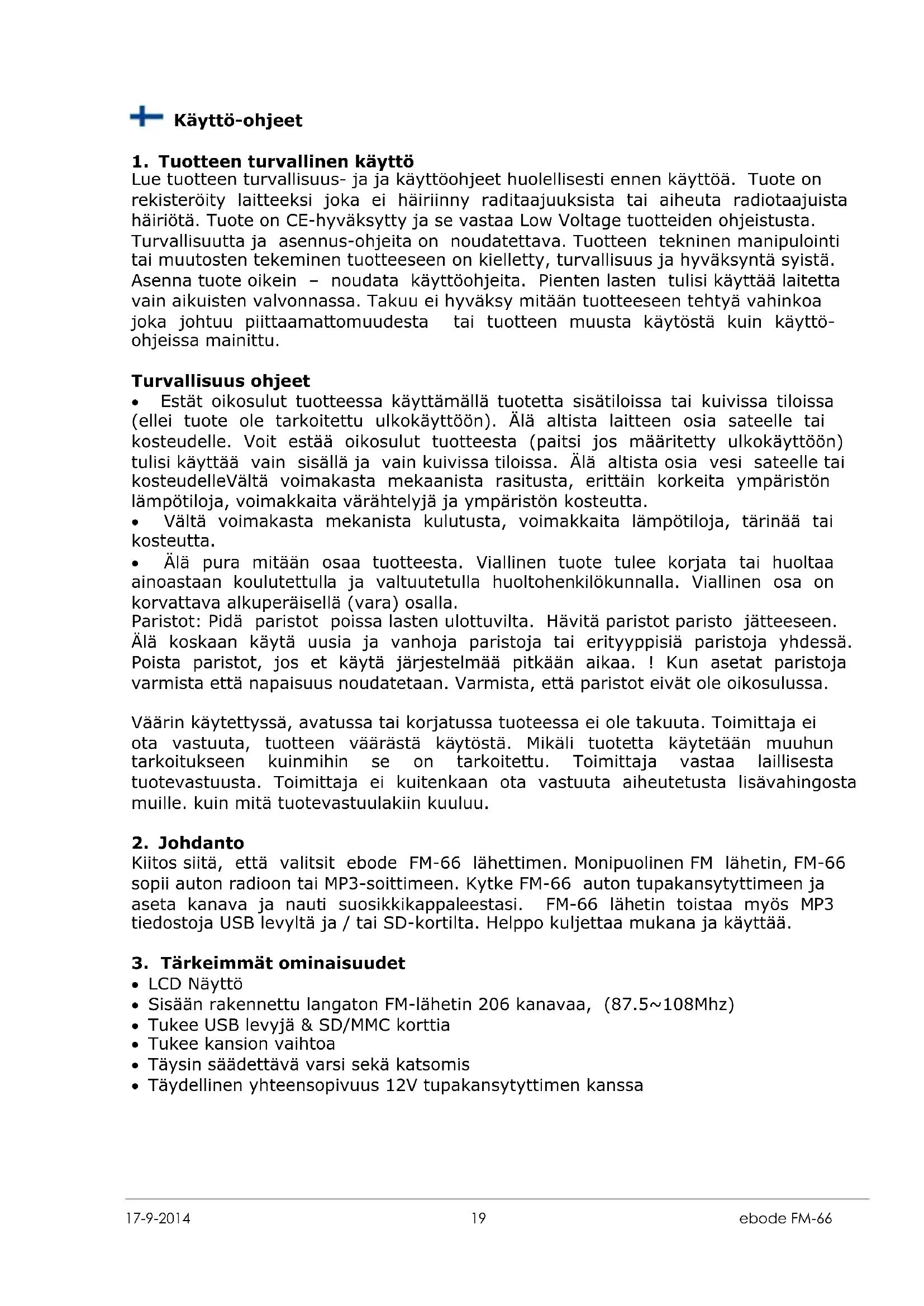 Kiitos siitä, etta valitsit ebode FM-66 lahettimen. Monipuolinen FM lahetin, FM-66 sopii auton radioon tai MP3-soittimeen. Kytke FM-66 auton tupakansytyttimeen ja aseta kanava ja nauti suosikkikappaleestasi. FM-66 lahetin toistaa myös MP3 tiedostoja USB levyltä ja / tai SD-kortilta. Helppo kuljettaa mukana ja käytää.