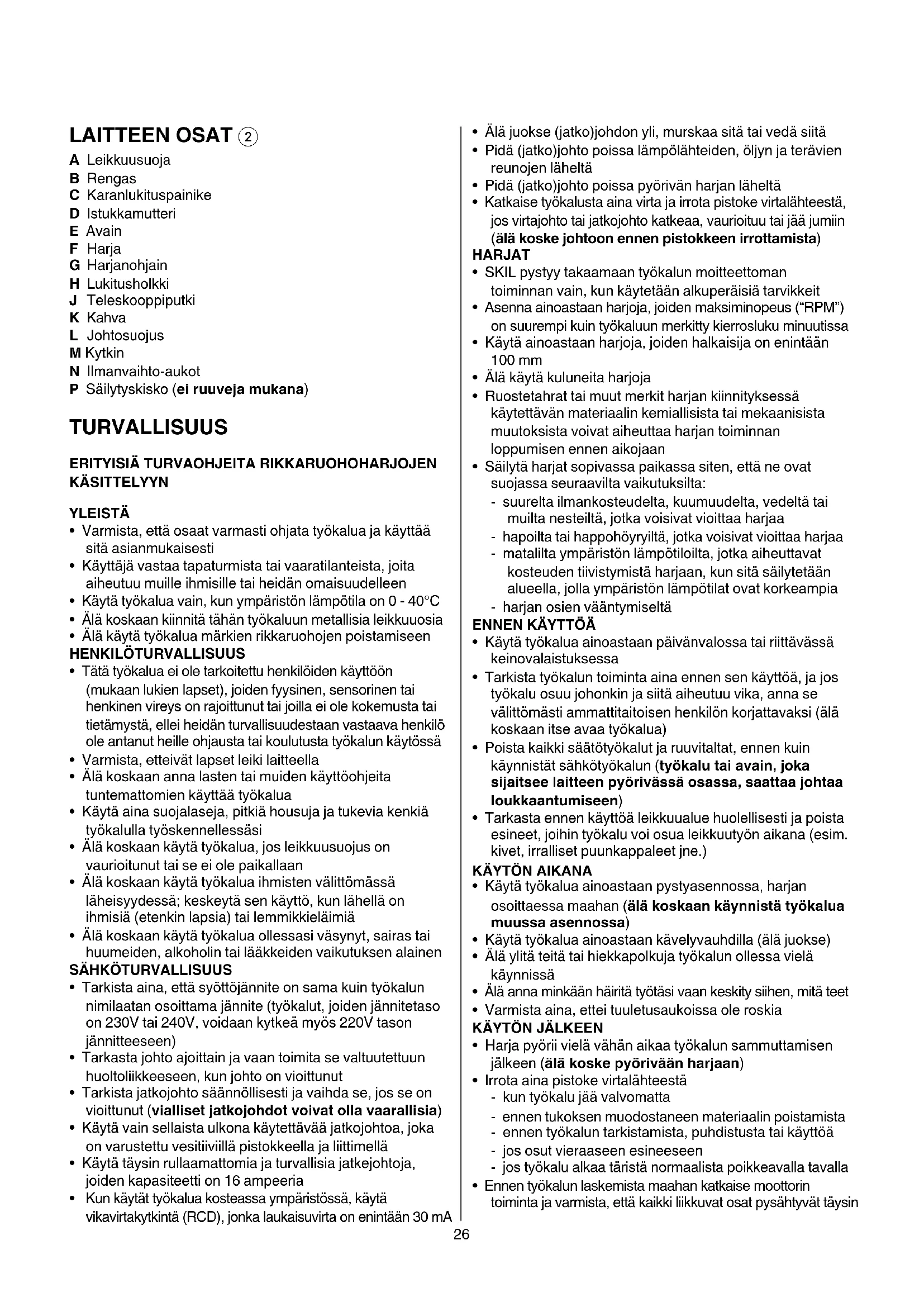 - Kiinnitäerityistähuomiotaturvallisuuttakoskeviin ohjeisiinjavaroituksiin;näidenlaiminlyöntivoi aiheuttaavakavanvaurioitumisen TEkNISET TIEDOT 126 lAITTEEN OSAT 2 A Leikkuusuoja B Rengas C Karanlukituspainike D Istukkamutteri E Avain F Harja G Harjanohjain H Lukitusholkki J Teleskooppiputki k Kahva l Johtosuojus m Kytkin N Ilmanvaihto-aukot P Säilytyskisko (eiruuvejamukana) TURVALLISUUS ERITYISIÄTURVAOHJEITARIKKARUOHOHARJOJEN kÄSITTElYYN YlEISTÄ