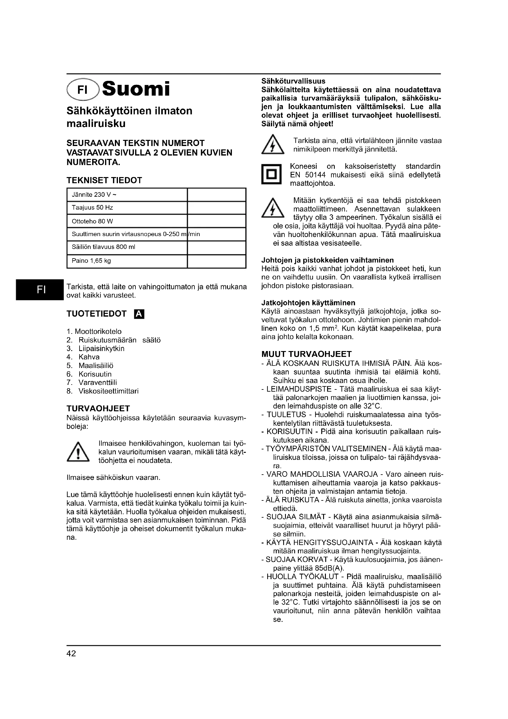 TURVAOHJEET Näissä käyttöohjeissa käytetään seuraavia kuvasym- boleja: Ilmaisee henkilövahingon, kuoleman tai työ- kalun vaurioitumisen vaaran, mikäli tätä käyt- töohjetta ei noudateta. Ilmaisee sähköiskun vaaran. Lue tämä käyttöohje huolelisesti ennen kuin käytät työ- kalua. Varmista, että tiedät kuinka työkalu toimii ja kuin- ka sitä käytetään. Huolla työkalua ohjeiden mukaisesti, jotta voit varmistaa sen asianmukaisen toiminnan. Pidä tämä käyttöohje ja oheiset dokumentit työkalun muka- na. Sähköturvallisuus Sähkölaitteita käytettäessä on aina noudatettava paikallisia turvamääräyksiä tulipalon, sähköisku- jen ja loukkaantumisten välttämiseksi. Lue alla olevat ohjeet ja erilliset turvaohjeet huolellisesti. Säilytä nämä ohjeet! Tarkista aina, että virtalähteen jännite vastaa nimikilpeen merkittyä jännitettä. Koneesi on kaksoiseristetty standardin EN 50144 mukaisesti eikä siinä edellytetä maattojohtoa. Mitään kytkentöjä ei saa tehdä pistokkeen maattoliittimeen. Asennettavan sulakkeen täytyy olla 3 ampeerinen. Työkalun sisällä ei ole osia, joita käyttäjä voi huoltaa. Pyydä aina päte- vän huoltohenkilökunnan apua. Tätä maaliruiskua ei saa altistaa vesisateelle. Johtojen ja pistokkeiden vaihtaminen Heitä pois kaikki vanhat johdot ja pistokkeet heti, kun ne on vaihdettu uusiin. On vaarallista kytkeä irrallisen johdon pistoke pistorasiaan. Jatkojohtojen käyttäminen Käytä ainoastaan hyväksyttyjä jatkojohtoja, jotka so- veltuvat työkalun ottotehoon. Johtimien pienin mahdol- linen koko on 1,5 mm