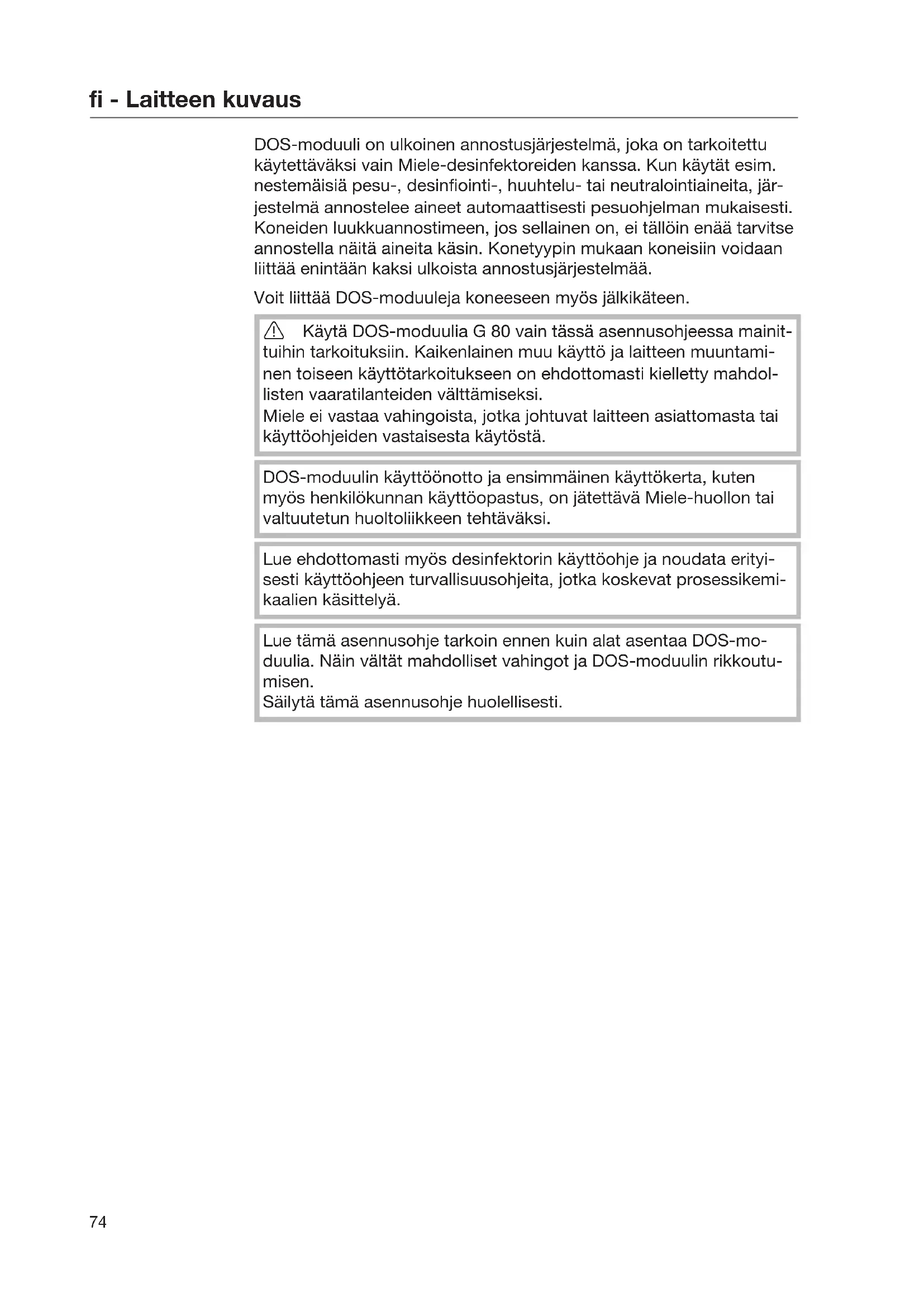 DOS-moduuli on ulkoinen annostusjärjestelmä, joka on tarkoitettu käytettäväksi vain Miele-desinfektoreiden kanssa. Kun käytät esim. nestemäisiä pesu-, desinfiointi-, huuhtelu- tai neutralointiaineita, jär- jestelmä annostelee aineet automaattisesti pesuohjelman mukaisesti. Koneiden luukkuannostimeen, jos sellainen on, ei tällöin enää tarvitse annostella näitä aineita käsin. Konetyypin mukaan koneisiin voidaan liittää enintään kaksi ulkoista annostusjärjestelmää. Voit liittää DOS-moduuleja koneeseen myös jälkikäteen. Käytä DOS-moduulia G80 vain tässä asennusohjeessa mainit- tuihin tarkoituksiin. Kaikenlainen muu käyttö ja laitteen muuntami- nen toiseen käyttötarkoitukseen on ehdottomasti kielletty mahdol- listen vaaratilanteiden välttämiseksi. Miele ei vastaa vahingoista, jotka johtuvat laitteen asiattomasta tai käyttöohjeiden vastaisesta käytöstä. DOS-moduulin käyttöönotto ja ensimmäinen käyttökerta, kuten myös henkilökunnan käyttöopastus, on jätettävä Miele-huollon tai valtuutetun huoltoliikkeen tehtäväksi. Lue ehdottomasti myös desinfektorin käyttöohje ja noudata erityi- sesti käyttöohjeen turvallisuusohjeita, jotka koskevat prosessikemi- kaalien käsittelyä. Lue tämä asennusohje tarkoin ennen kuin alat asentaa DOS-mo- duulia. Näin vältät mahdolliset vahingot ja DOS-moduulin rikkoutu- misen. Säilytä tämä asennusohje huolellisesti.fi - Laitteen kuvaus