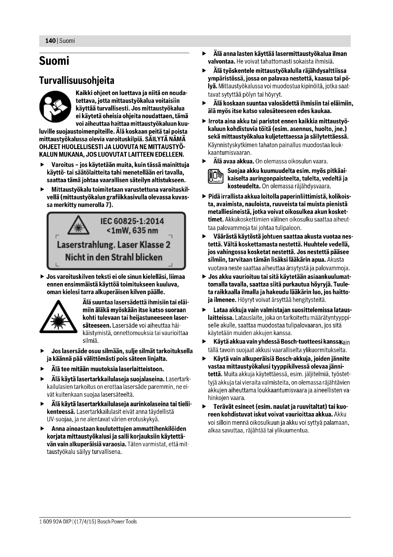 5) Käytettäessä Bluetooth®-Low-Energy -laitteita saattaa mallista ja käyttöjärjestelmästä riippuen olla mahdollista, että yhteyttä ei voida muodostaa. Bluetooth®-laitteiden on tuettava SPP-profiilia.6) rajoitettu tehokkuus, kun lämpötilat <0 °CTekniset tiedot määritetty toimitukseen kuuluvan akun kanssa. Tyyppikilvessä oleva sarjanumero 6 mahdollistaa mittaustyökalun yksiselitteisen tunnistuksen. Ø 40 mm Ø 55 mm Ø 100 mm 1 m 2 m 5 m Henk Becker Executive Vice President Engineering Helmut Heinzelmann Head of Product Certification PT/ETM9 OBJ_BUCH-2270-002.book Page 143 Friday, April 17, 2015 9:48 AM144 | Suomi 1 609 92A 0XP | (17/4/15) Bosch Power Tools Käytä vain teknisissä tiedoissa ilmoitettuja latauslait- teita. Vain nämä latauslaitteet on sopivat mittaustyökalus- sasi käytettävälle litiumioniakulle. Litiumioni-akkua voidaan ladata milloin vain, lyhentämättä akun elinikää. Latauksen keskeytys ei vaurioita akkua. Älä paina käyttöpainiketta enää mittaustyökalun auto- maattisen sammuttamisen jälkeen. Akku saattaa vahin- goittua. Kun haluat asentaa ladatun akun 30, työnnä se akkuaukkoon 29, niin että lukittuu tuntuvasti ja tasaisesti paikalleen mitta- ustyökalun kahvaan. Kun haluat irrottaa akun 30, paina vapautuspainikkeita 3 ja vedä akku ulos akkuaukosta 29. Noudata varovaisuutta, älä irrota väkisin. Paristokäyttö (3 601 K83 370) (katso kuva C) Kun haluat avata paristokotelon kannen 31, paina vapautus- painikkeita 3 ja ota paristokotelon kansi pois. Varmista oikea napaisuus paristojen asennuksessa paristoko- telon kannessa olevan kuvan mukaisesti. Asenna paristokotelon kansi 31 takaisin ja lukitse se tuntu- vasti paikalleen. Vaihda aina kaikki paristot samanaikaisesti. Käytä yksin- omaan saman valmistajan saman tehoisia paristoja. Poista paristot mittaustyökalusta, ellet käytä sitä pit- kään aikaan. Paristot saattavat hapettua tai purkautua it- sestään pitkäaikaisessa varastoinnissa. Lataustilan merkkivalo Näytössä oleva lataustilan näyttö g ilmoittaa paristojen tai akun 30 varaustilan. Käyttö Käyttöönotto Suojaa mittaustyökalu kosteudelta, suoralta auringon- paisteelta sekä pölyltä ja lialta. Älä aseta mittaustyökalua alttiiksi äärimmäisille läm- pötiloille tai lämpötilan vaihteluille. Älä esim. jätä sitä pitkäksi aikaa autoon. Anna suurten lämpötilavaihtelujen jälkeen mittaustyökalun lämpötilan tasaantua, ennen kuin käytät sitä. Äärimmäiset lämpötilat tai lämpötilavaihtelut voivat vaikuttaa mittaustyökalun tarkkuuteen. Anna mittaustyökalun mukautua ympäristön lämpöti- laan. Suurien lämpötilaerojen yhteydessä mukautuminen voi kestää jopa 15 minuuttia. Älä altista mittaustyökalua koville iskuille tai putoami- selle. Tarkastuta mittaustyökalu valtuutetussa Bosch- huollossa, jos työkalun kuoreen on kohdistunut voimakkai- ta iskuja tai jos havaitset siinä toimintahäiriöitä. Mittaustyökalu on varustettu radioliitännällä. Paikalli- sia käyttörajoituksia, esim. lentokoneissa tai sairaa- loissa, on noudatettava. Käynnistys ja pysäytys Irrota suojakansi 21 infrapunavastaanotinlinssin 23 päältä ja suojakansi 19 ilmankosteuden ja ympäristölämpötilan antu- rin 5 päältä. Huolehdi työn aikana siitä, että kamera 22, vastaanotinlinssi 23 ja anturi 5 eivät ole suljettuina tai peitossa, koska muuten mittaukset epäonnistuvat. Käynnistä mittauslaite painamalla käynnistyspainiketta 12 tai mittauspainiketta 4. Näyttöön 18 tulee käynnistyssek- venssi. Käynnistyssekvenssin jälkeen mittaustyökalu on vii- meksi tehdyn poiskytkennän yhteydessä tallennetussa käyt- tömuodossa. Laser ei ole vielä kytketty päälle. Vain ensimmäisen käyttöönottokerran yhteydessä näyttöön tulee käynnistyssekvenssin jälkeen lisäksi valikko ”Laite”, jossa voit määrittää mittaustyökalun asetukset, esimerkiksi kaikkien näyttöjen kielen (käyttö, katso ”Alivalikko ”Laite””, sivu 149). Vahvista valitut asetukset painamalla vasenta toi- mintopainiketta 17. Kaikkia asetuksia voidaan muuttaa myös jälkikäteen alivalikossa ”Laite”. Älä jätä kytkettyä mittaustyökalua ilman valvontaa ja sammuta mittaustyökalu käytön jälkeen. Lasersäde saattaa häikäistä muita henkilöitä. Älä koskaan suuntaa lasersädettä ihmisiin tai eläimiin, älä myöskään itse katso lasersäteeseen edes kaukaa. Tehdasasetuksena näytön valaistuksen kirkkautta vähenne- tään energian säästämiseksi, jos mitään painiketta ei paineta 30 sekuntiin. Kun painat mitä tahansa painiketta, näytön va- laistus kirkastuu jälleen täyteen voimakkuuteensa. Valikossa ”Valaistuksen kesto” voit muuttaa tätä valaisuaika (katso ”Valaistuksen kesto”, sivu 150). Kun haluat sammuttaa mittaustyökalun, paina käynnistyspai- niketta. Mittaustyökalu tallentaa nykyisen käyttömuodon se- kä asetukset ja sammuu sen jälkeen. Asenna suojakansi 21 ta- kaisin vastaanotinlinssin 23 päälle ja suojakansi 19 ilmankosteuden ja ympäristölämpötilan anturin 5 päälle. Älä sammuta mittaustyökalua akkua tai paristosovinta irrotta- malla, koska tämä voi vaurioittaa sisäistä muistia. Valikossa ”Poiskytkentäaika” voit asettaa, sammutetaanko mittaustyökalu automaattisesti, jos sen painikkeita ei paineta tai jos sillä ei tehdä mittausta, ja minkä ajan kuluttua sammu- tus tapahtuu (katso ”Poiskytkentäaika”, sivu 149). Myös au- tomaattisen sammutuksen yhteydessä nykyinen käyttömuoto sekä asetukset tallennetaan muistiin. Jos akku tai mittaustyökalu eivät ole teknisissä tiedoissa il- moitetun käyttölämpötilan rajoissa, mittaustyökalu sammute- taan hetken kestävän varoituksen (katso ”Viat – Syyt ja korja- us”, sivu 150) jälkeen automaattisesti. Anna mittaustyökalun mukautua käyttölämpötilaan ja kytke se sitten jälleen päälle. Energian säästämiseksi kytke mittaustyökalu päälle vain sil- loin, kun käytät kyseistä ty