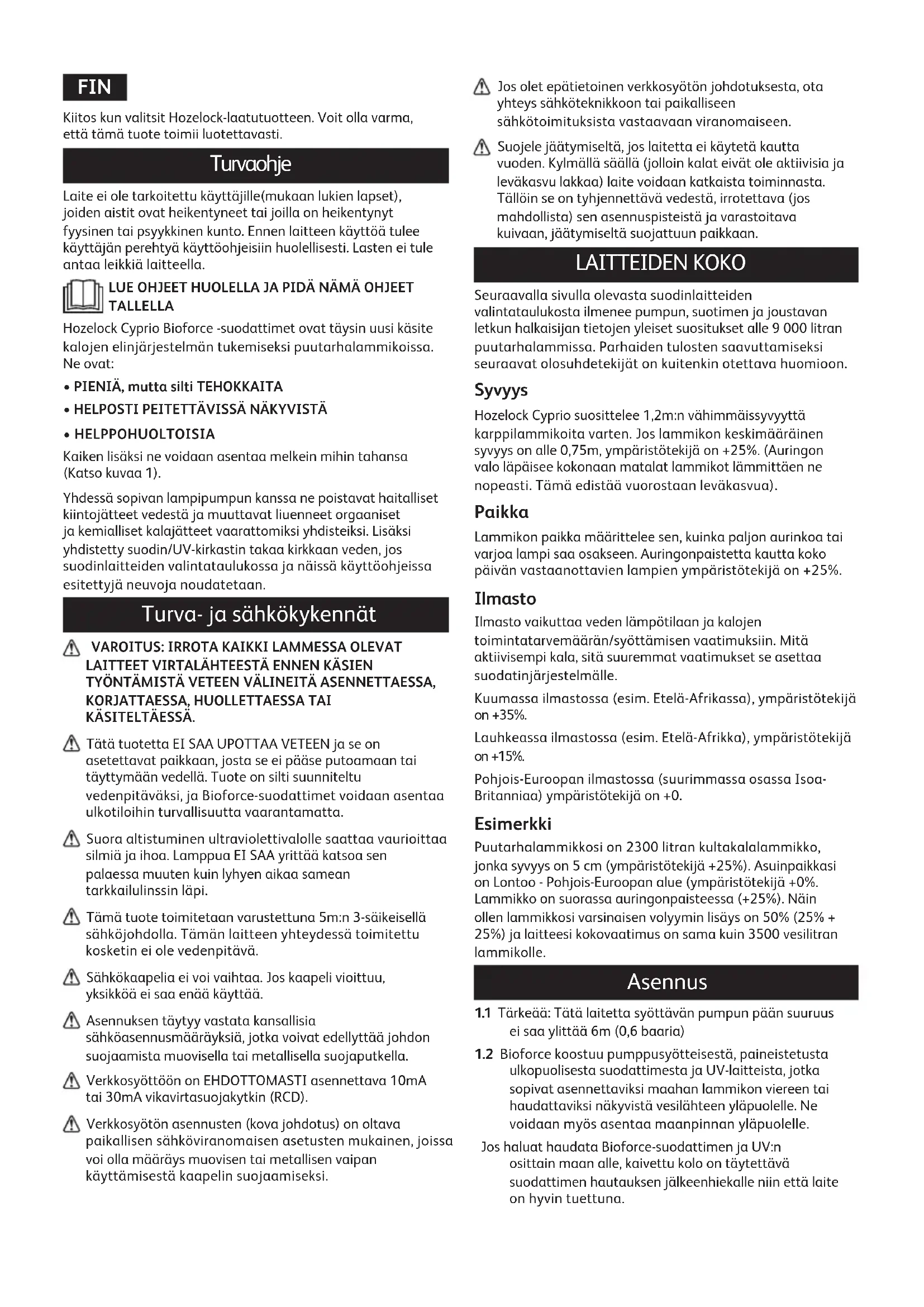 TYÖNTÄMISTÄVETEENVÄLINEITÄASENNETTAESSA, KORJATTAESSA,HUOLLETTAESSATAI KÄSITELTÄESSÄ. Tätä tuotetta EI SAA UPOTTAA VETEEN ja se on asetettavat paikkaan, josta se ei pääse putoamaan tai täyttymään vedellä. Tuote on silti suunniteltu vedenpitäväksi, ja Bioforce-suodattimet voidaan asentaa ulkotiloihin turvallisuutta vaarantamatta. Suora altistuminen ultraviolettivalolle saattaa vaurioittaa silmiä ja ihoa. Lamppua EI SAA yrittää katsoa sen palaessa muuten kuin lyhyen aikaa samean tarkkailulinssin läpi. Tämä tuote toimitetaan varustettuna 5m:n 3-säikeisellä sähköjohdolla. Tämän laitteen yhteydessä toimitettu kosketin ei ole vedenpitävä. Sähkökaapelia ei voi vaihtaa. Jos kaapeli vioittuu, yksikköä ei saa enää käyttää. Asennuksen täytyy vastata kansallisia sähköasennusmääräyksiä, jotka voivat edellyttää johdon suojaamista muovisella tai metallisella suojaputkella. Verkkosyöttöön on EHDOTTOMASTI asennettava 10mA tai 30mA vikavirtasuojakytkin (RCD). Verkkosyötön asennusten (kova johdotus) on oltava paikallisen sähköviranomaisen asetusten mukainen, joissa voi olla määräys muovisen tai metallisen vaipan käyttämisestä kaapelin suojaamiseksi. Jos olet epätietoinen verkkosyötön johdotuksesta, ota yhteys sähköteknikkoon tai paikalliseen sähkötoimituksista vastaavaan viranomaiseen. Suojele jäätymiseltä, jos laitetta ei käytetä kautta vuoden. Kylmällä säällä (jolloin kalat eivät ole aktiivisia ja leväkasvu lakkaa) laite voidaan katkaista toiminnasta. Tällöin se on tyhjennettävä vedestä, irrotettava (jos mahdollista) sen asennuspisteistä ja varastoitava kuivaan, jäätymiseltä suojattuun paikkaan. LAITTEIDEN KOKO Seuraavalla sivulla olevasta suodinlaitteiden valintataulukosta ilmenee pumpun, suotimen ja joustavan letkun halkaisijan tietojen yleiset suositukset alle 9 000 litran puutarhalammissa. Parhaiden tulosten saavuttamiseksi seuraavat olosuhdetekijät on kuitenkin otettava huomioon. Syvyys Hozelock Cyprio suosittelee 1,2m:n vähimmäissyvyyttä karppilammikoita varten. Jos lammikon keskimääräinen syvyys on alle 0,75m, ympäristötekijä on +25%. (Auringon valo läpäisee kokonaan matalat lammikot lämmittäen ne nopeasti. Tämä edistää vuorostaan leväkasvua). Paikka Lammikon paikka määrittelee sen, kuinka paljon aurinkoa tai varjoa lampi saa osakseen. Auringonpaistetta kautta koko päivän vastaanottavien lampien ympäristötekijä on +25%. Ilmasto Ilmasto vaikuttaa veden lämpötilaan ja kalojen toimintatarvemäärän/syöttämisen vaatimuksiin. Mitä aktiivisempi kala, sitä suuremmat vaatimukset se asettaa suodatinjärjestelmälle. Kuumassa ilmastossa (esim. Etelä-Afrikassa), ympäristötekijä on +35%. Lauhkeassa ilmastossa (esim. Etelä-Afrikka), ympäristötekijä on +15%. Pohjois-Euroopan ilmastossa (suurimmassa osassa Isoa- Britanniaa) ympäristötekijä on +0. Esimerkki Puutarhalammikkosi on 2300 litran kultakalalammikko, jonka syvyys on 5 cm (ympäristötekijä +25%). Asuinpaikkasi on Lontoo - Pohjois-Euroopan alue (ympäristötekijä +0%. Lammikko on suorassa auringonpaisteessa (+25%). Näin ollen lammikkosi varsinaisen volyymin lisäys on 50% (25% + 25%) ja laitteesi kokovaatimus on sama kuin 3500 vesilitran lammikolle. Asennus