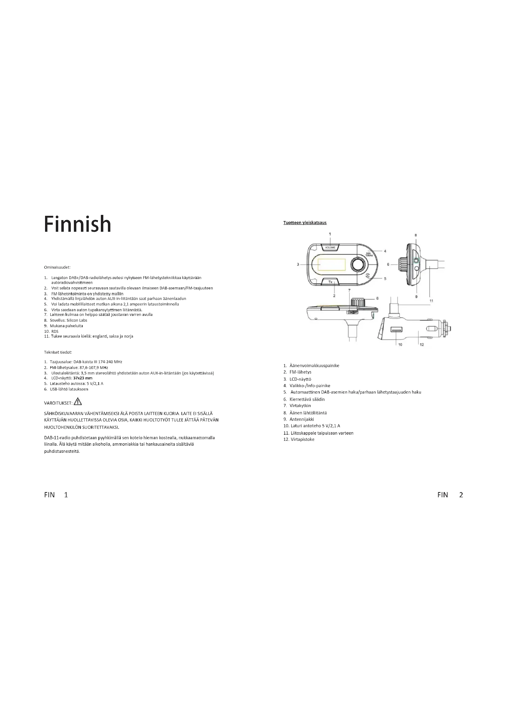 VAROITUKSET: SÄHKÖISKUVAARAN VÄHENTÄMISEKSI ÄLÄ POISTA LAITTEEN KUORIA. LAITE EI SISÄLLÄ KÄYTTÄJÄN HUOLLETTAVISSA OLEVIA OSIA, KAIKKI HUOLTOTYÖT TULEE JÄTTÄÄ PÄTEVÄN HUOLTOHENKILÖN SUORITETTAVAKSI. DAB-11-radio puhdistetaan py yhkimällä sen kotelo hieman kostealla, nukkaamaomalla liinalla. Älä käytä mitään alkoholia, ammoniakkia tai hankausaineita sisältäviä puhdistusnesteitä.