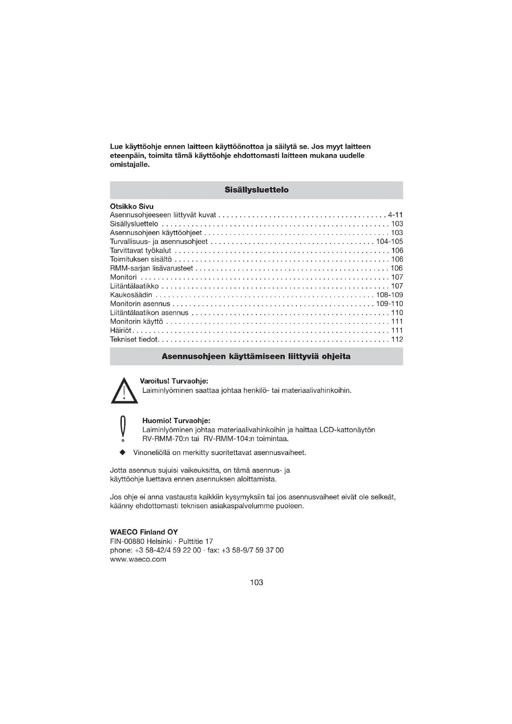 Turvallisuus- ja asennusohjeet WAECO International ei vastaa seuraavista syistä aiheutuvista vahingoista: a) Asennusvirhe. b) Mekaanisista vaikutuksista ja ylijännitteistä aiheutuvat järjestelmävauriot. c) Laitteessa tehdyt muutokset ilman WAECO Internationalin nimenomaista lupaa. d) Käyttö muihin kuin asennusohjeissa mainittuihin tarkoituksiin. Varoitus! Riittämättömien johtoliitosten seurauksena voi olla, että oikosulku: - sytyttää kaapelit palamaan - laukaisee turvatyynyn - vaurioittaa elektronisia ohjauslaitteita aiheuttaa sähköisten toimintojen (vilkku, jarruvalot, äänitorvi, sytytys, valot) vikaantumisen Huomioi siksi seuraavat ohjeet: Ajoneuvon johtoja koskevissa töissä on huomioitava seuraavat pinnemerkinnät: 30 (akun plusnavan tulo suoraan) 15 (kytketty plus, akun takaosa) 31 (paluujohto akusta, massa) 58 (peruutusvalo) Turvallisin liitosmuoto on juottaa kaapelinpäät yhteen ja lopuksi eristää ne. Uudelleen irrotettavissa liitoksissa on käytettävä ainoastaan eristettyjä kaapelinkenkiä, pistokkeita ja litteitä pistohylsyjä. Älä käytä ruuvattavia pinteitä. Käytä liitinpihtiä kaapelien liittämiseen kaapelikenkien, pistokkeiden tai littei den pistohylsyjen kanssa. Kaapeliliitoksissa 31:een (massa): Ruuvaa kaapeli yhdessä kaapelikengän ja hammaslevyn kanssa ajoneuvon omaan maadoitusruuviin tai yhdessä kaapelikengän, peltiruuvin ja hammaslevyn kanssa autokorinlevyyn. Kiinnitä huomiota hyvään massakosketukseen! Varoitus! Ennen ajoneuvon sähköpuolen parissa suoritettavia töitä on akun miinusnapa aina irrotettava oikosulkuvaaran vuoksi. Ajoneuvoissa, joissa on lisäakku, on irrotettava myös miinusnapa pinteestä. Huomio! Irrotettaessa akun miinusnapa menetetään mukavuuselektroniikan kaikkiin haa- voittuviin muisteihin tallennetut tiedot.Turvallisuus- ja asennusohjeet Seuraavat tiedot on syötettävä ajoneuvon varustuksesta riippuen uudelleen: radiokoodi · ajoneuvon kello · ajastin · ajoneuvon tietokone · istuimen asento Säätöohjeet löytyvät ko. käyttöohjeesta. Varoitus! LCD-kattonäytön RV-RMM-70 tai RV-RMM-104 osat, jotka on asennettu ajoneuvoon, on kiinnitettävä siten, että ne eivät irtoa missään tilanteessa (äkkinäinen jarrutus, liikennetapaturma), eivätkä siten aiheuta matkustajien loukkaantumisia. Varmista monitoria sijoitettaessa, ettei monitoria asenneta TURVATYYNYN vaikutusalueelle. Muuten on turvatyynyn lauetessa olemassa loukkaantumisvaara. Älä asenna monitoria alueelle, jossa pää saattaa osua siihen. Huomio! Sähköjohtojen jännitteen tarkistamiseksi saa käyttää vain diodi- testauslamppua (katso .A 1) tai volttimetriä (katso A 2). Tarkastuslamput (katso A 3), jossa on hehkulanka, ottavat liian korkean virran vastaan ja ajoneuvon elektroniikka voi vaurioitua. Huomio! Vaurioiden välttämiseksi on varmistuttava siitä, että poran terän ulostuloa varten löytyy riittävästi vapaata tilaa (katso A 4). Poista jäysteet kaikista porarei’istä ja suojaa reiät ruosteenestolla. Huomio! Kiinnitä sähköliitosten asetuksessa huomiota siihen, että: