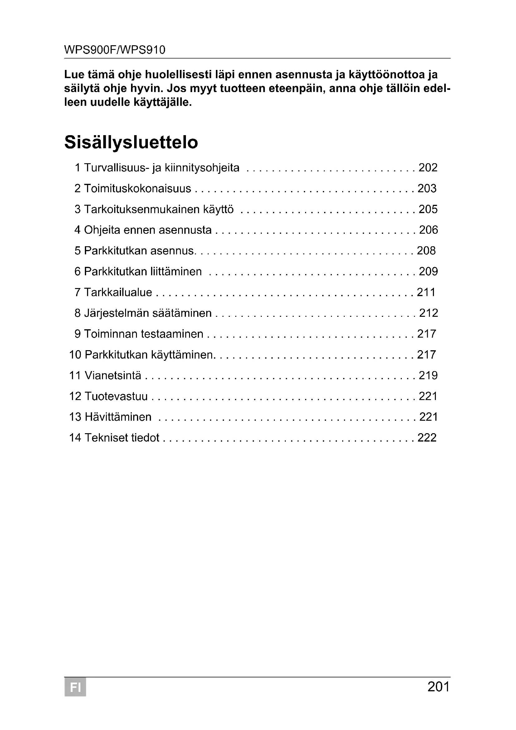 - 14 Tekniset tiedot FI Turvallisuus- ja kiinnitysohjeita WPS900F/WPS910 p. 222