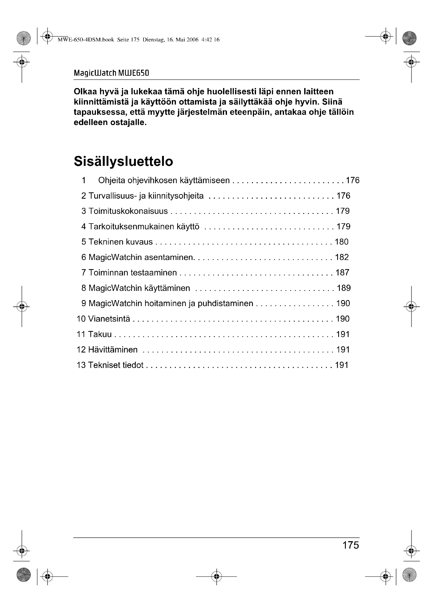 - 13 Tekniset tiedot MWE-650-4DSM.book Seite 175 Dienstag, 16. Mai 2006 4:42 16Ohjeita ohjevihkosen käyttämiseen MagicWatch MWE650 p. 191