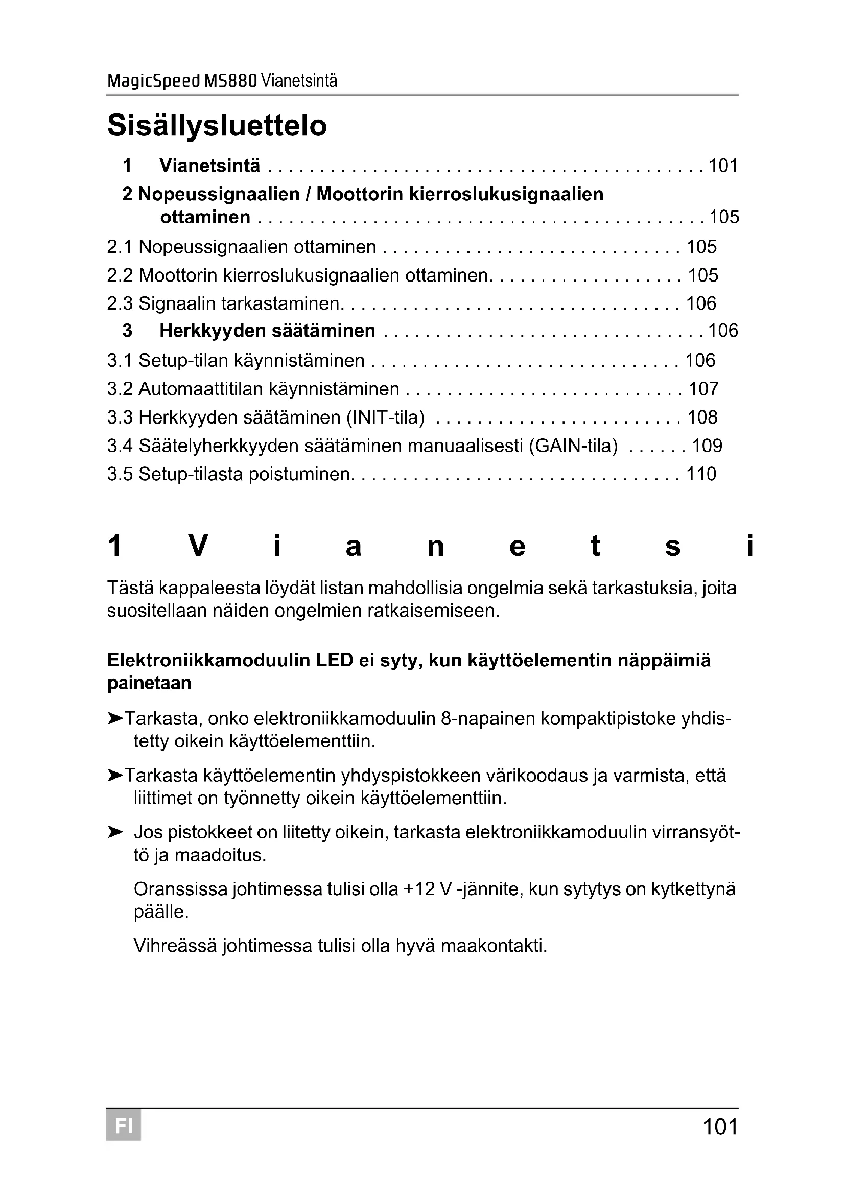 Voit ottaa moottorin kierroslukusignaalin seuraavista paikoista: PaikkaJännite Taajuus Moottorinohjaimen kautta välittyvä nopeussignaali 1,5 – 24 6 – 8500Elektroninen kierroslukumittari(kojerakenneryhmän takapuolella tai osaryhmänä kojerakenneryhmässä)1,5 – 24 6 – 8500Nopeusanturi(on asennettu vaihteistoon ja siinä on yleensä kolme johdinta)1,5 – 24 6 – 8500Autoradio(autoradion lähellä, jos ajoneuvossa on ISO-lii-täntä. Nopeussignaali on tällöin kennossa 3, nastassa 1 tai 5)1,5 – 24 6 – 8500PaikkaJännite Taajuus Moottorinohjaimen kautta välittyvä moottorin kier-roslukusignaali1,5 – 24 6 – 8500Elektroninen kierroslukumittari(kojerakenneryhmän takapuolella tai osaryhmänä kojerakenneryhmässä)1,5 – 24 6 – 488Sytytyspuolan negatiivinen napapuoli (liitin 1)(tällaisessa liitännässä täytyy käyttää keltaista johdinta)6 – 250 6 – 488 _Diag_MS880.book Seite 105 Donnerstag, 26. April 2012 7:32 19FI Herkkyyden säätäminen MagicSpeed MS880